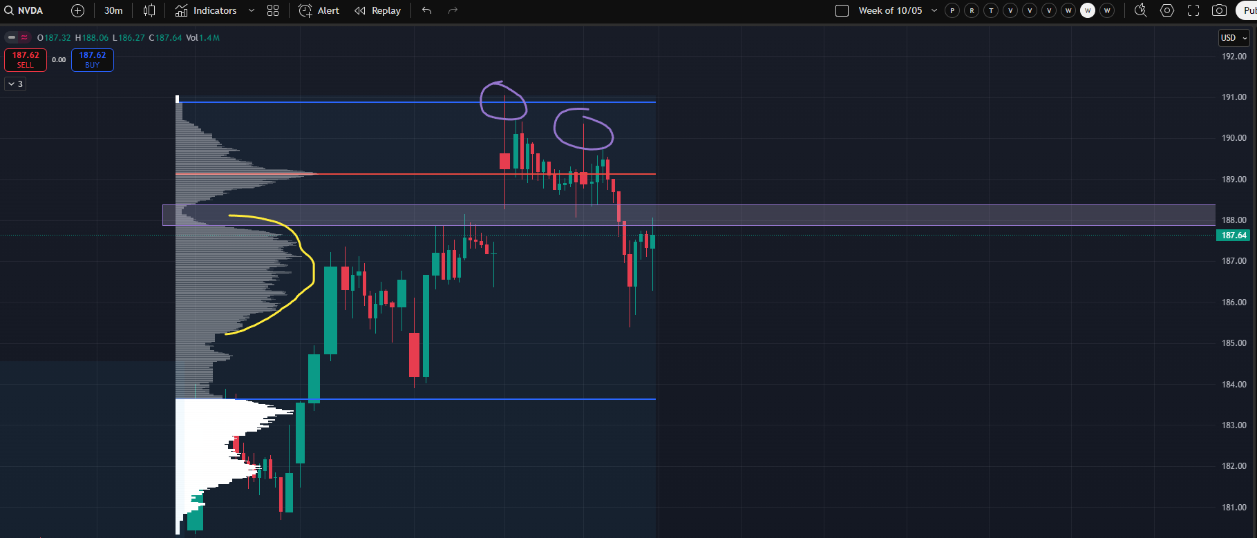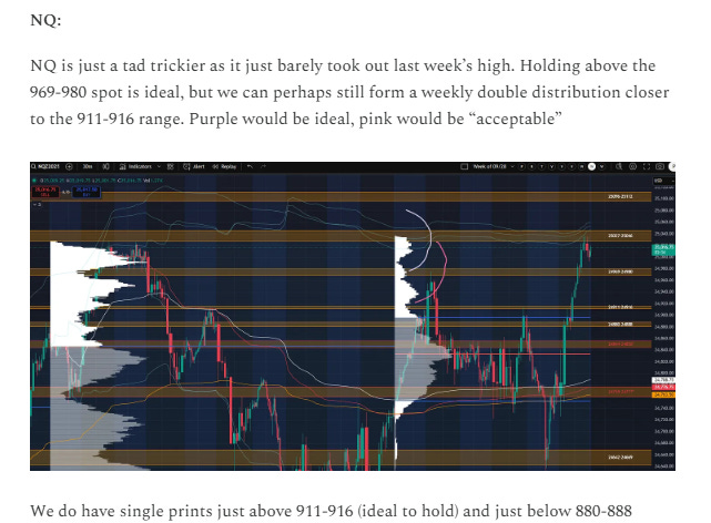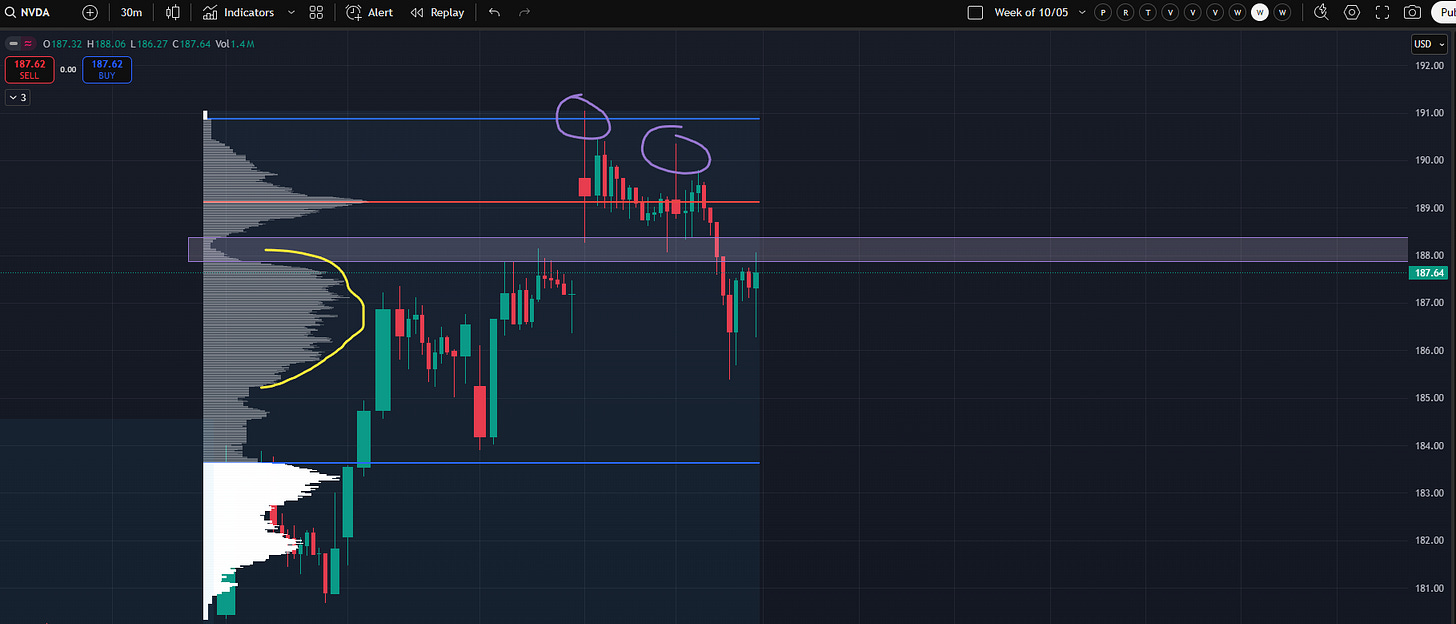 One fact which should broadly temper significant bearishness (aside from the obvious trading near an all-time high) is the fact that NQ does not have a “good” high. It’s high was made premarket Friday and is relatively poor in character. A cash hours excess high (see the starter kit) would be a potential sign of the end of an upward move. I’ll use NVDA as an example of what a “good” high looks like. Note the consecutive excess highs on Thursday and Friday leading to potential acceptance back in the next distribution lower on last week’s profile.