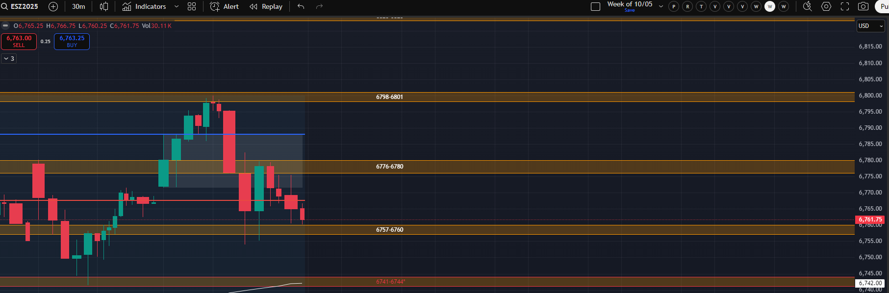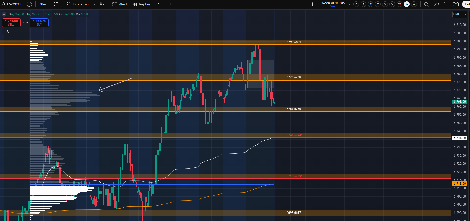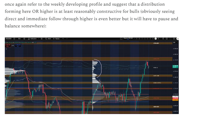 If we trade higher and sustain above last week’s high, then I would broadly be targeting 6863-6866. This would be subject to change if we end up with a LAAF of last week’s high and then take out a prior day low.