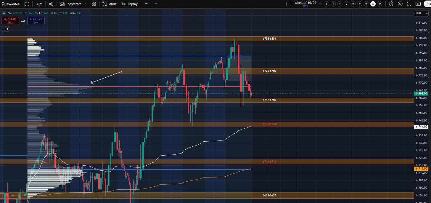 Holding 6757-6760 (with allowance for a quick LBAF of Friday’s low) would be ideal for bulls. ES did not take out Thursday’s low on Friday, and I believe remains broadly constructive for direct continuation above 6741-6744. There wasn’t a huge ton of volume put in above 6780 but filling out volume between 6741 and 6800 would be fine.