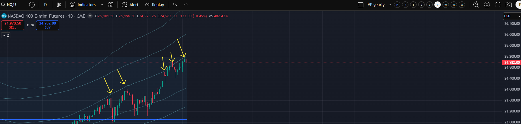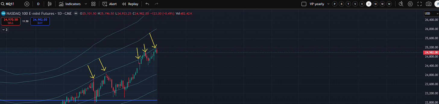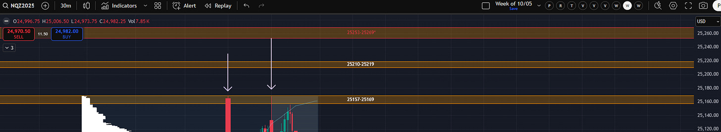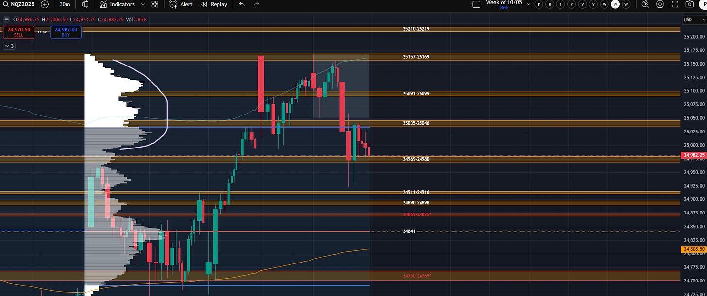 If you’ve been a member since 2023, we’ve seen this setup play out a few times. It generally begins with a prolonged grind into the +2 YTD VWAP which leads to shallow pullbacks and what I call “stacked balances.” Effectively we get boxes that sit right on top of each other and even overlap a bit. The risk (in general) is that the loss of one box can trigger a test of the bottom of the next, which, if lost, can trigger a test of the bottom of the next. In such a strong market it is perhaps dangerous to operate under the assumption that this plays out to completion. We will discuss this further if/when it plays out. It is worth noting that we started monitoring for this setup two weeks before it played out in spring of 2024 so the concept can be carried forward regardless regarding this area.