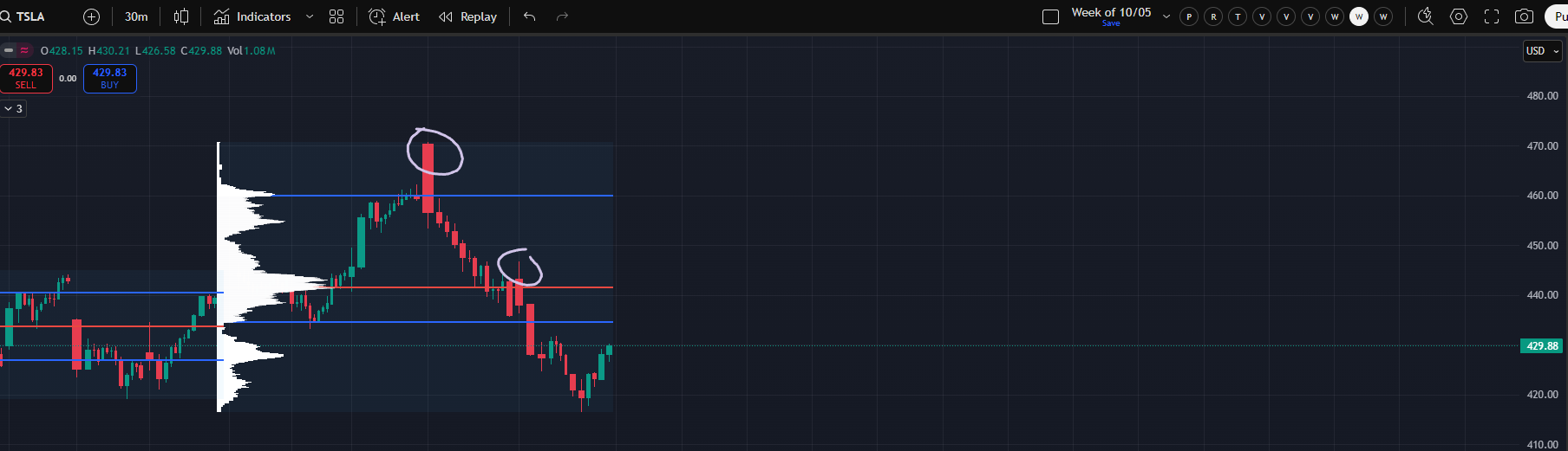 We have (thus far) a 2-day balance on QQQ from Thursday and Friday (blue box). This sits on top of the 5-day balance we monitored after FOMC (orange shaded). On 9/25 we got the LBAF (circled in pink) of this 5-day balance which held (and cleared) demand that was left behind from FOMC day (9/17) which had formed its own 4-day balance (white box). The purple circle represents the clearing of demand from the pink circle. Then there is the obvious trendline off the trap day low which is simply too perfect for me. Such perfect holds of a trendline are often a sign of shorter timeframe participants who have weaker hands and are readily liquidated.