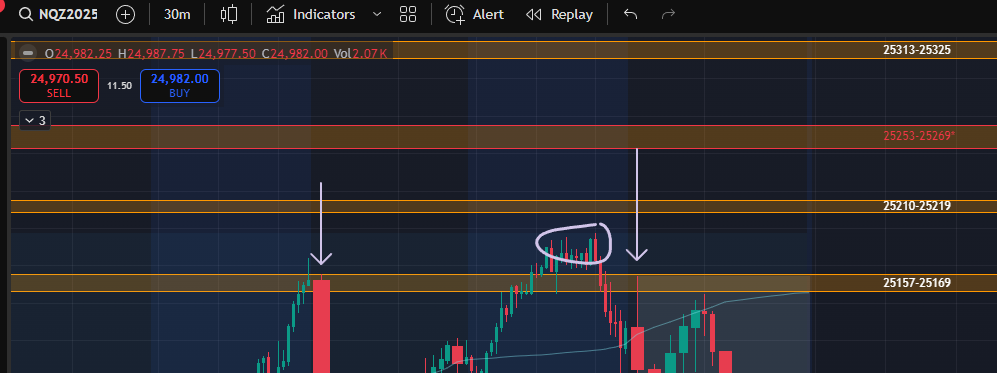 Note the consecutive cash hours excess highs on NQ (purple arrows) BUT the relatively flat (non-excess) high made in premarket (purple circle). I am of course not a purist, but a cash hours excess high is always preferred when looking downward off an all-time high.