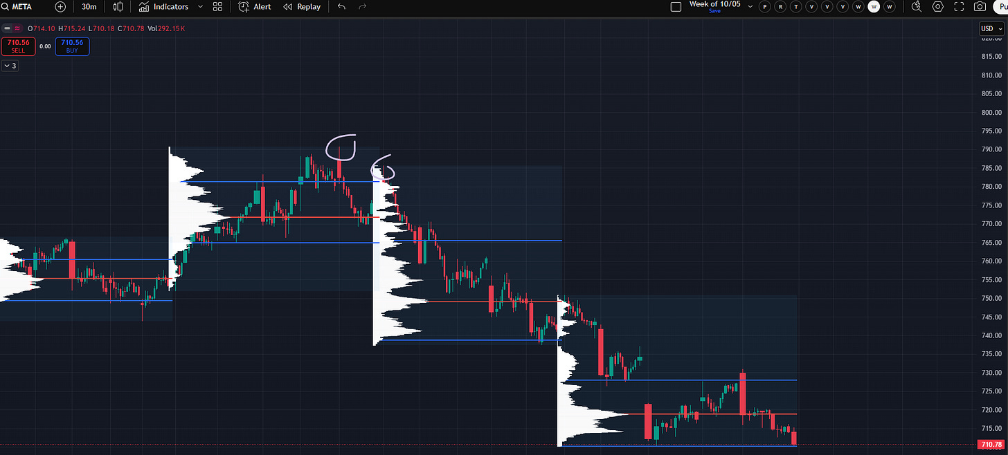 While an excess high on its own doesn’t make a top, this is precisely what a top looks like before it confirms. My point in posting this NVDA top excess high is of course simply to illustrate what is not present on NQ. META is another good example of a top sequence of consecutive excess highs that is simply not present on NQ.