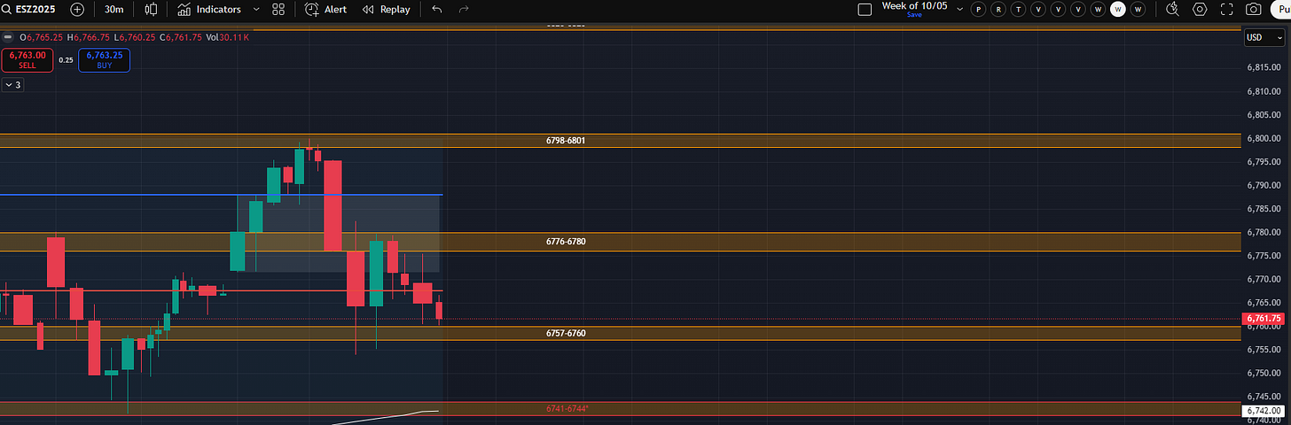 It is a bit of a warning sign that NQ took out a prior day low so soon after a break of the orange range from the QQQ chart. If ES were to take out Thursday’s 6741.5 low on Monday (especially with NQ taking out Friday’s low) then both indices would be in a 30-minute downtrend. We will have daily levels in the plan for Monday which could trigger a LBAF of either Friday or Thursday’s low. Given the strength of this market, perhaps that is all bulls need to avoid the trap door setup and rip to new highs.
