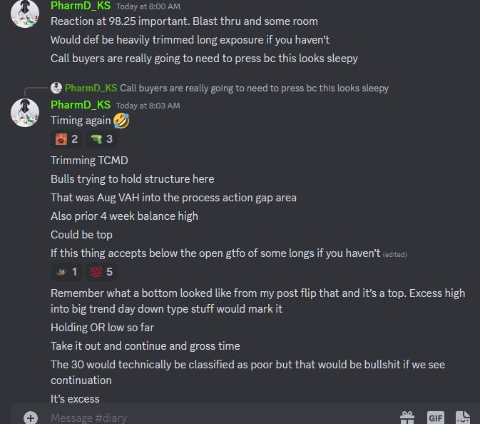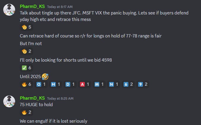 ES 4598.25 was a major key level into today (4597 HOD) and I called out live that buyers looked tired and that it could be top. The index immediately nuked after I said that. While it may not be the top (discussed in tonight’s post), in order to protect our profits on longs I strenuously reiterated aggressively taking profits and that I would not be longing the index today (with a bit of joking mixed in).