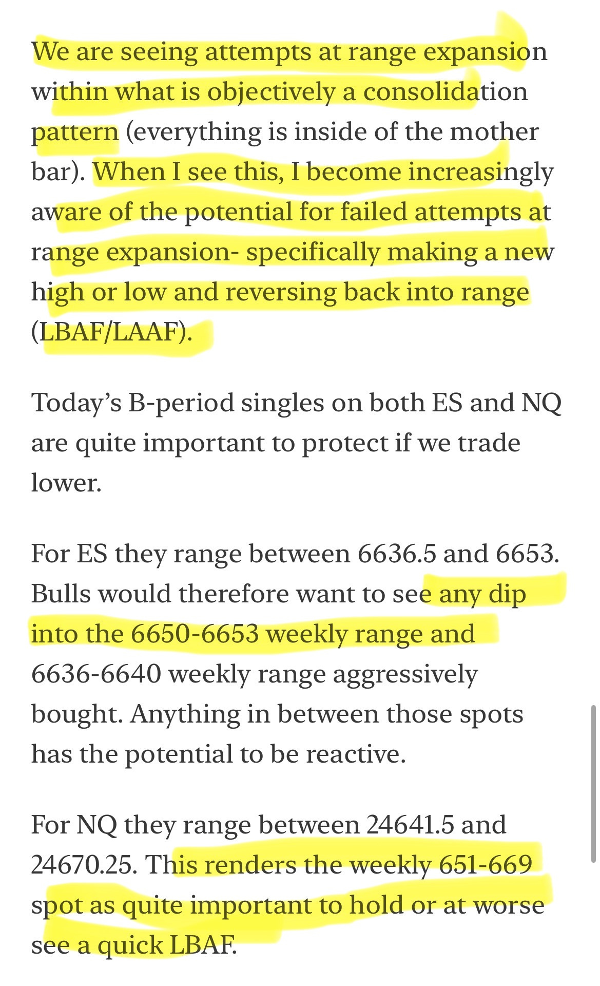 This morning ES filled Friday’s single prints (and then some) but NQ fell short. This led to a “failed attempt at range expansion” which led them to reverse back into range.