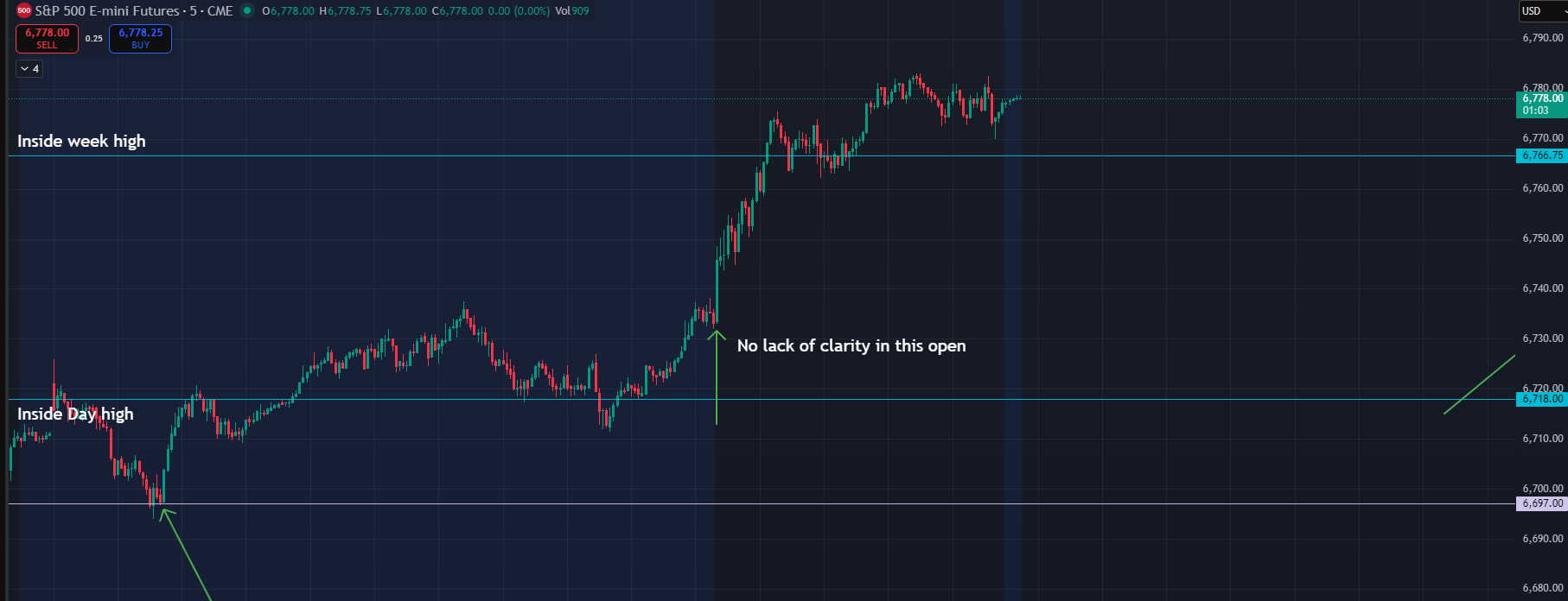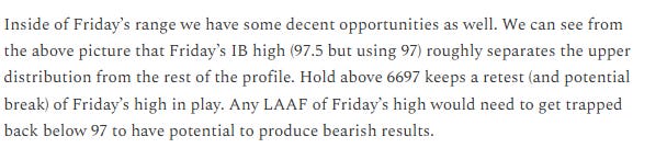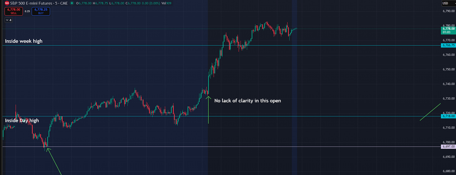 Today opened on a true gap up (see the starter kit) and there was no lack of clarity in the 5-minute opening range (see the starter kit). A sustained break of Friday’s inside day (we gap opened above it) targeted last week’s (an inside week) high. Sustaining above the inside week high (we’ll find out tomorrow) targets the top of the mother bar.