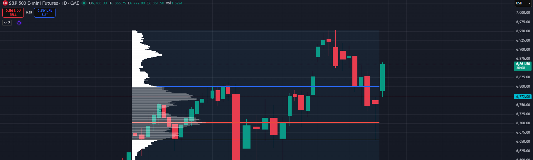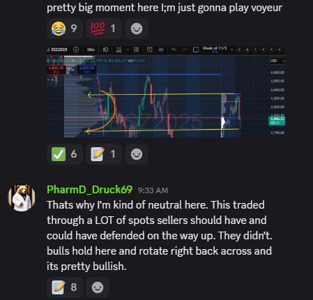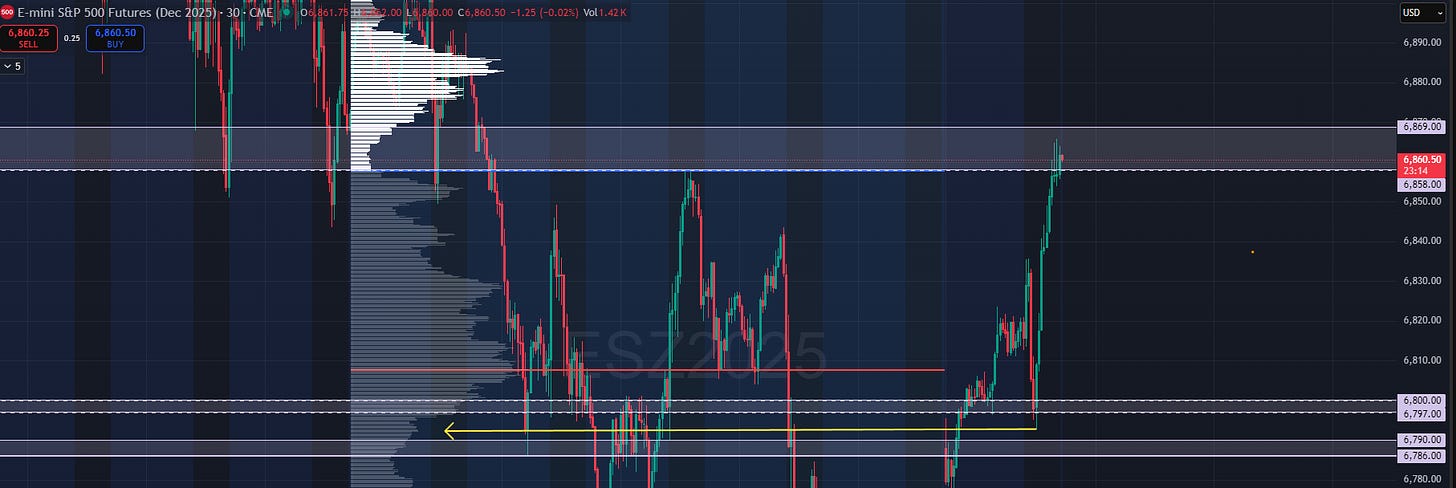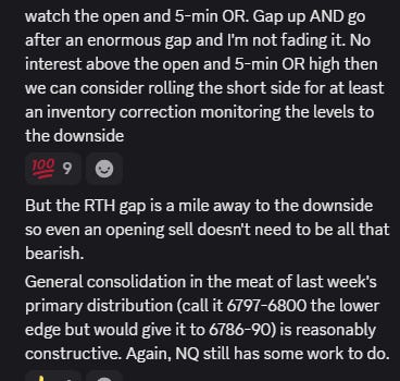 The opening drive was higher, and while there was a delayed inventory correction (pullback) all it did was come back to the lower edge of last week’s primary distribution. This allowed for the completion of a rotation to the 6860s. From the weekend plan and the Discord (premarket update and real time during the sell):