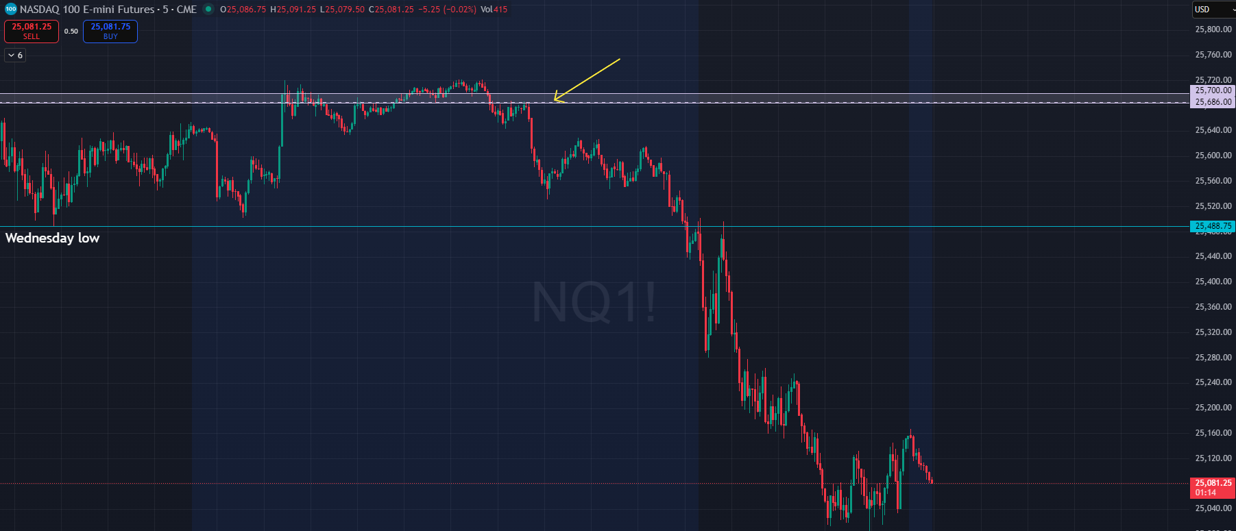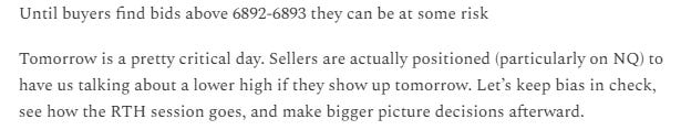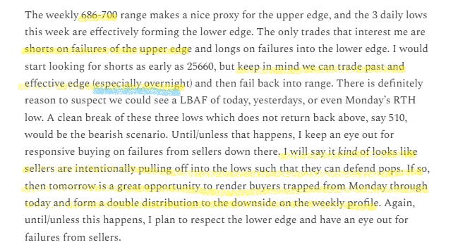 Today probably snuck up on a lot of people, but there were some breadcrumbs. Two days in a row NQ sellers pulled up JUST short of the prior day low. While at first it reeked of weakness (and was a great opportunity to get long intraday) it started to feel a bit suspicious given the action that followed yesterday. There was once again a scam pump overnight to overshoot the “upper effective edge,” RTH gap opened right at the lower edge and sold immediately. They do indeed have people talking about a lower high after today.