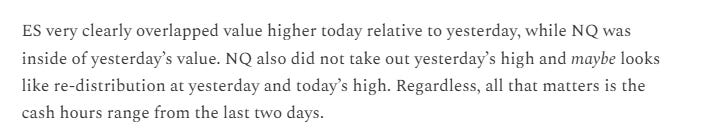 Today could have gone either way. The index had sat for 2 days with relative equal lows just above its prior breakout area. Two days in a row had held during cash hours, and two days in a row had rejected its prior range from last week and Monday. From last night’s plan and today at close:
