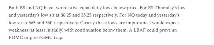 Both ES and NQ had relative equal daily lows and due their location in their respective profiles a LBAF was a solid long setup and indeed proved to be a pre-FOMC trap