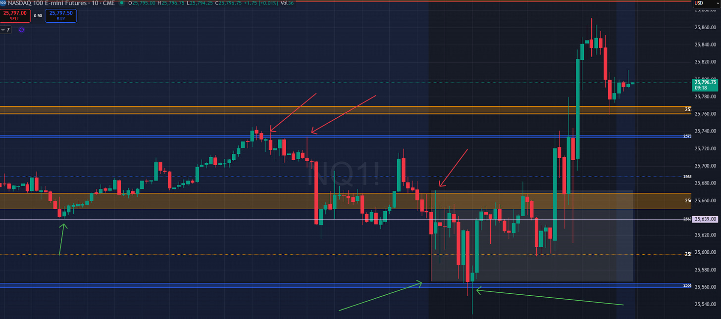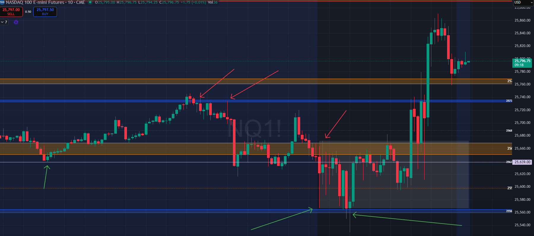 NQ was at risk of a liquidation break which targeted the relative equal lows at 25560-25565.