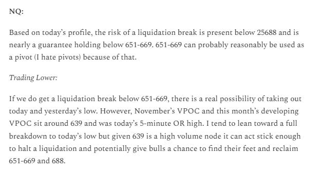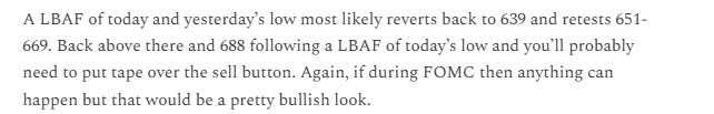 We can see the initial selloff overnight held 639 (639.25, sorry about that) and just ended up being a long. However, this produced nothing but a look above and fail of yesterday’s high. The liquidation break completed to within a hair of its target by 9:35 AM. The continued offer of 651-669 led to a proper completion of the target which did nothing but turn into a long setup (look below and fail of those relative equal lows)