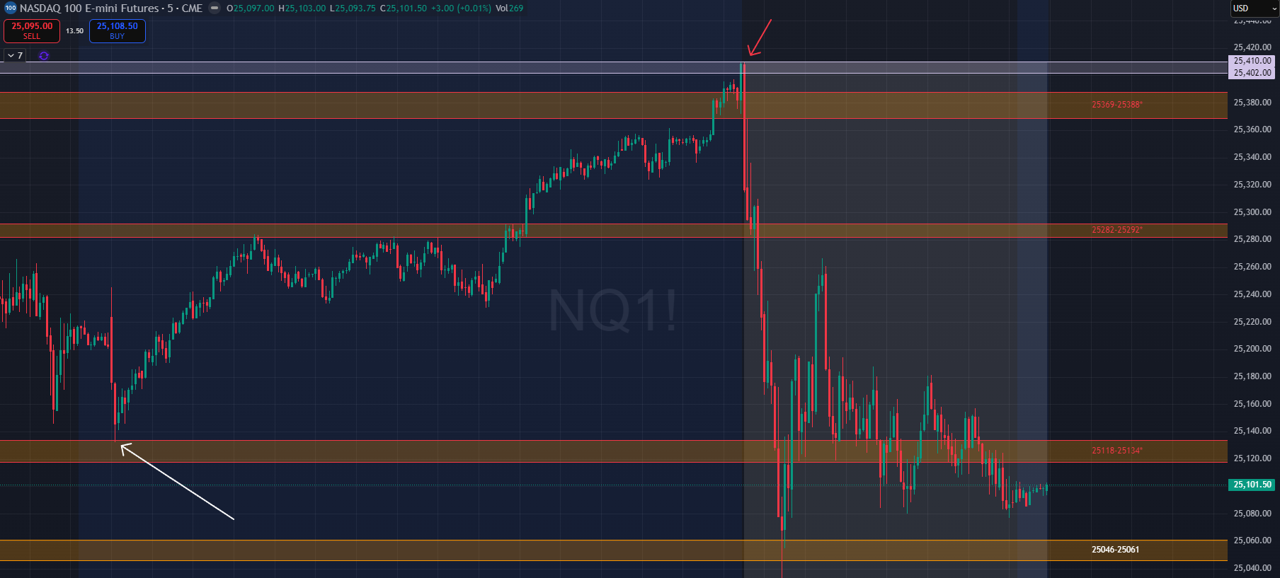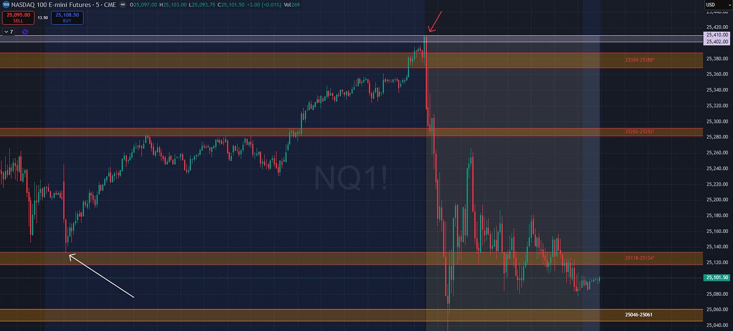 In the plan for today I suggested the NQ setup was the best I had seen in some time, and it didn’t fail to disappoint. The idea was to short a failed push through 25369-25388, with 402-410 as the first likely candidate to cause the failure. NQ sold hard in a straight line nearly 400 handles. ES was the same exact structural setup and sold off 65 handles.