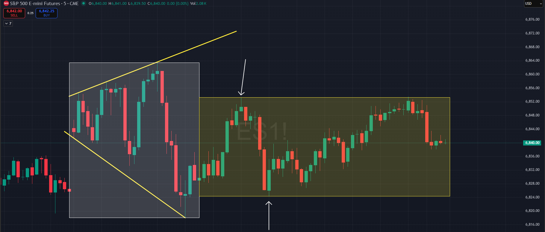 The morning on ES was a very clear broadening formation, inclusive or taking out the IB low (twice actually) and the IB high. A “good” high and a “good” low were in by 11:30. Once I then see a lower high AND a higher low (white arrows) I am completely done for the day. I’ll set an alert for the “internal” high and low and only after one is taken out will I consider a trade. Everything else is by definition inside chop (the boxes are intended to represent composite candles). Yellow is inside of white, and the index is going nowhere.