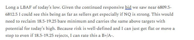 The LBAF of yesterday’s low (always cash hours unless otherwise specified) put in low of night in the weekly 6809.5-6812.5 range.