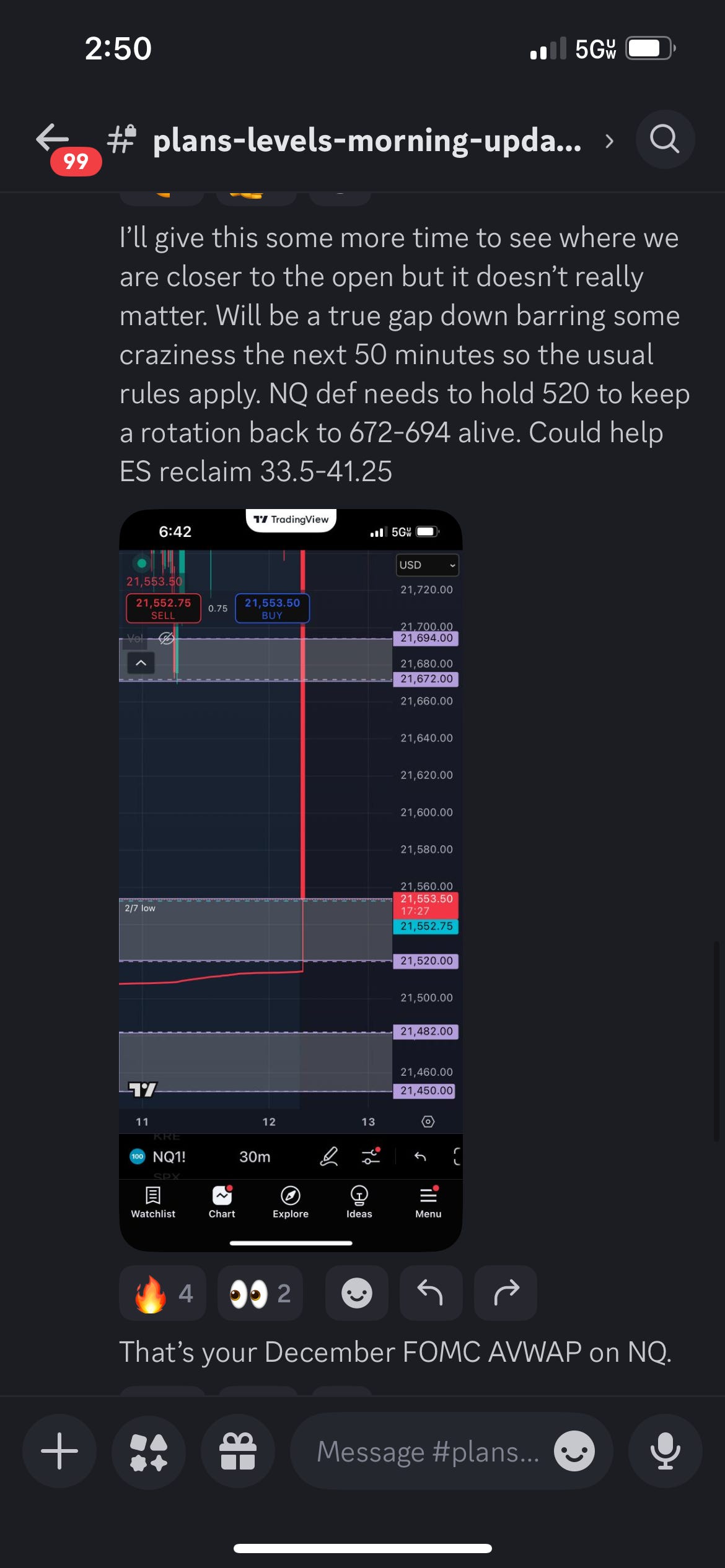 For today we were just focused on the weekly levels. The same thing that had happened repeatedly lately happened again today. A major level was lost (again in news) and bulls simply bid the next level down, and were able to reclaim the prior level. For me today, NQ 21672-21694 was the key battleground. The data candle traded straight through it to the next weekly levels, 21520-21552.75. This corresponded to the December FOMC VWAP and it held.