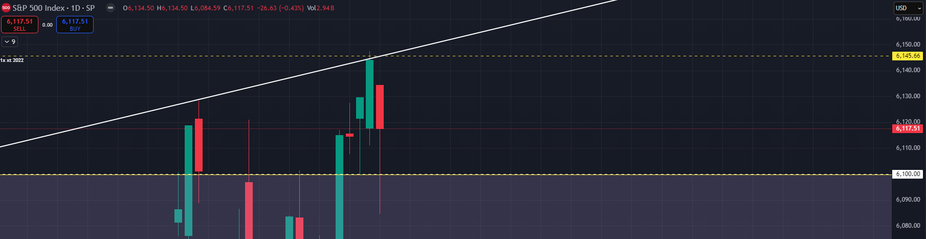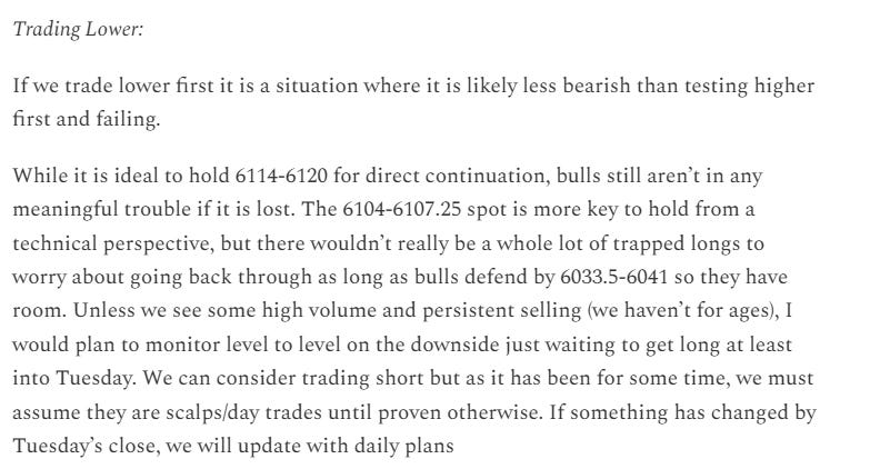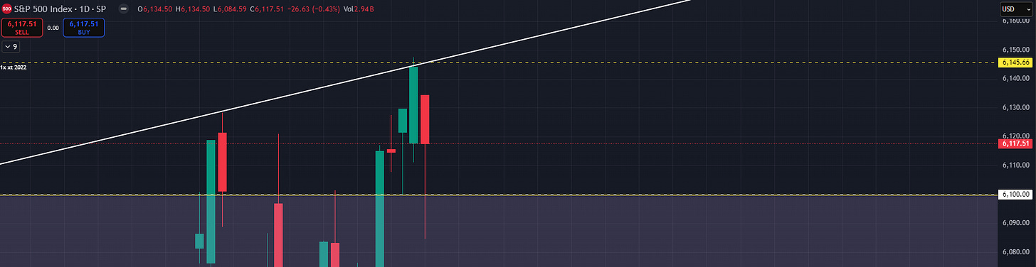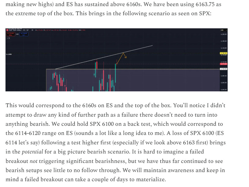 We have been prepared for yesterday’s SPX 6145.66 test since the weekend. The only question was (and still is) whether or not this spot produces a major swing high or if today was just a dip to get long for new highs. From the weekly plan, which I aim to keep quite objective when I’m laying out moves days ahead of time: