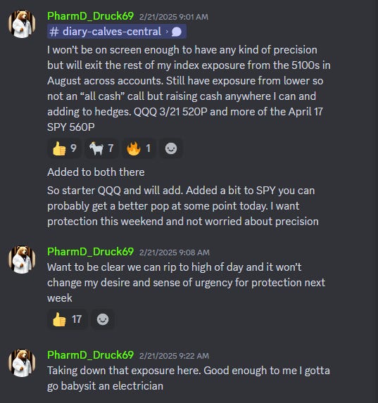 We have been quite cautious for some time, particularly as we approached 6145.66 SPX and the 6160s on ES. I had broadly raised cash and had a hedge in place against UPS 0.00%↑ JNJ 0.00%↑ UWMC 0.00%↑ and FXY 0.00%↑ longs. FXY calls and JNJ were bright green on Friday, UPS was basically flat, and UWMC was down (had just taken profit. We have remained positioned conservatively so these big down days on the index don’t hurt. We had exited ACHR 0.00%↑ on Wednesday after taking profit on Tuesday’s pop as we had expected an unwind in MTUM 0.00%↑ which would impact ACHR.