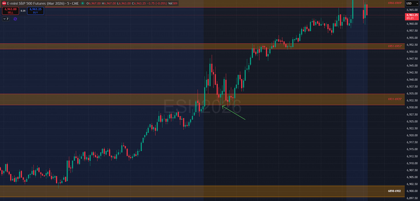 This is one of those situations in auction market theory that seems backward to most traders. Just below 6931-6935 was “expensive” and just above 6931-6935 was “cheap.” Now that NVDA earnings is out of the way, these levels can be carried forward. In tonight’s plan I’ll discuss upside targets should this sustain, along with downside targets should it not.