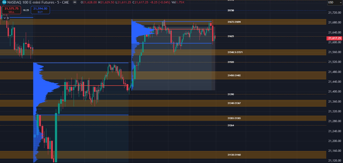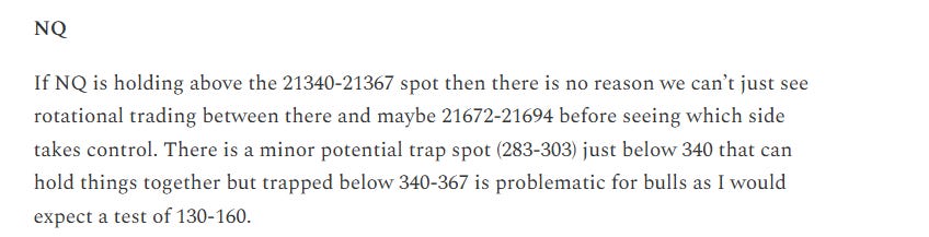 We can see that once 21340-21367 was reclaimed on Monday (futures had gapped well below it) we saw higher highs and higher lows up to 21672-21694. Today’s high was 21694 to the tick. I would certainly carry forward these two spots at least: