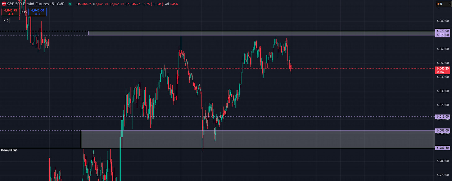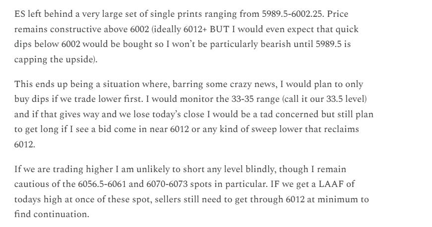 Today was effectively all about ES 5989.5 for me. The overnight action was once again rather volatile. After gapping at the open just below our 6070-6073 spot, futures sold off all night. When we trade higher first and fail, it often requires patience in waiting for the right dip. The session was straight down, clearly on a missing to fill the single prints. If you are not familiar with single prints (you’re missing out) see the starter kit above. Once the single prints were filled (we traded 2 handles lower into our weekly level) futures recovered and began an uptrend into the open. Looking at the below picture once can see it is likely reasonable to carry these spots forward over the next two days. The single prints sat just above the Sunday overnight high and Monday’s opening drive high.