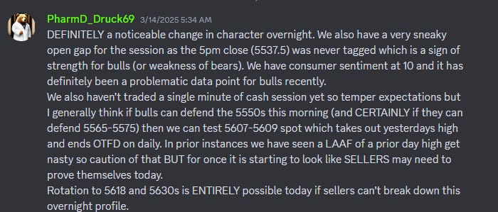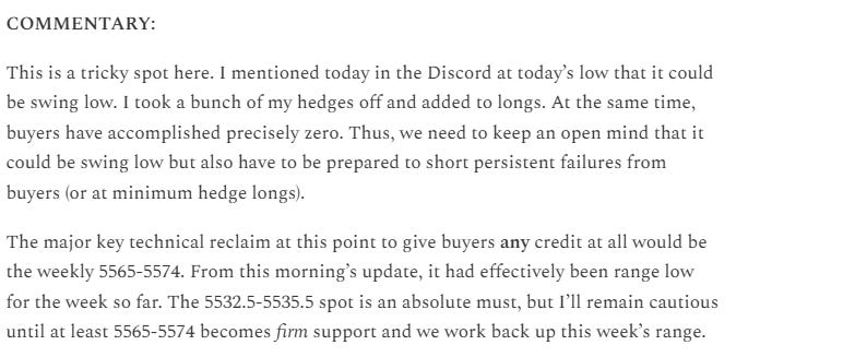 On Friday buyers accomplished their first key technical reclaim which was 5565-5574 which set us up for taking longs for the first time in a while. From the plan the night before and the morning update: