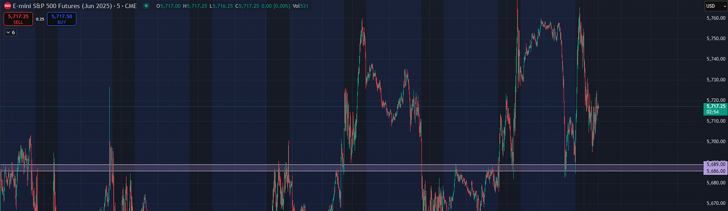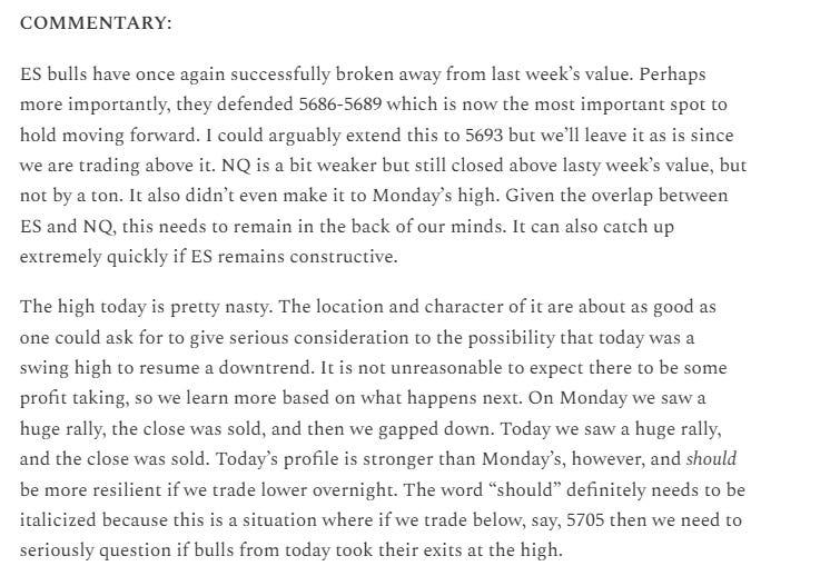 Yesterday’s late rip followed by an overnight selloff was eerily similar to Monday into Tuesday. The key difference this time was that bulls held 5686-5689 at the open and retraced the entire overnight move. However, sellers stepped in quite strong at the highs once again and drove price back down near low of day. From last night with some additional thoughts added:
