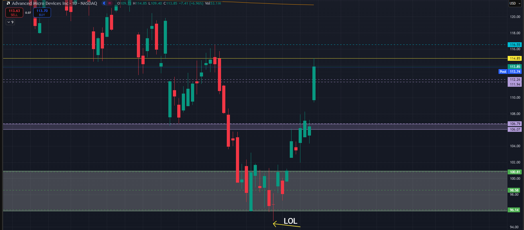 Unfortunately for cash hours traders, much of this move was taken overnight as futures gap opened at 6pm at 5740 and never really looked back, opening cash session at 5782.5. I’m not personally a fan of trading large gaps so I was content to enjoy the swing gains today, particularly the move on AMD 0.00%↑ which tagged a pretty obvious resistance today: