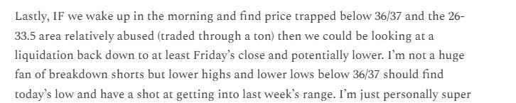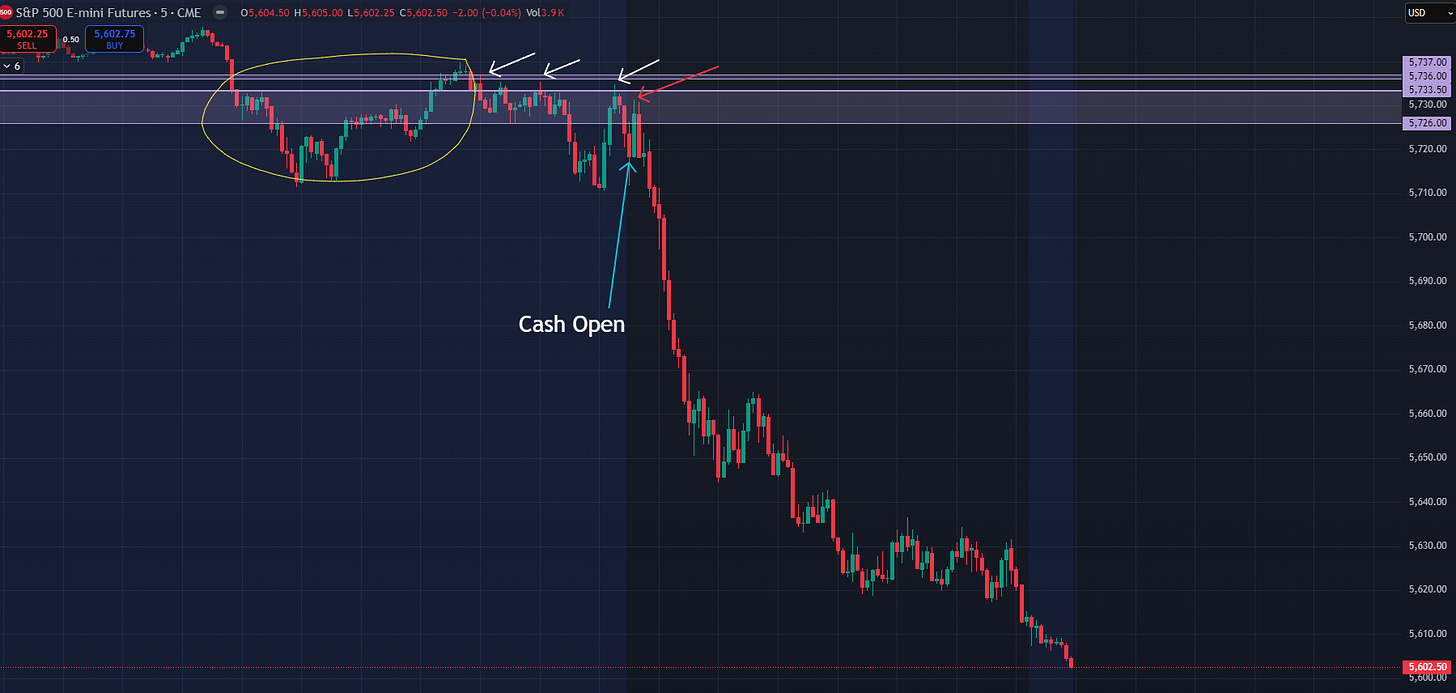 I mentioned above the paywall the bearish cross of the 21ema below the 200 sma and Friday’s action didn’t fail to disappoint. After Thursday’s brief pause of the active trend (we got a doji candle) Friday saw a gap down and go that never really looked back. We’ve talked about the major 5726-5733.5 spot for weeks. I added 36/37 after Thursday’s action as a potential warning sign that a liquidation was looming. We had thoroughly traded through 26-33.5 overnight (yellow), woke up trapped below 36/37 (white), opened below 26 (blue), and put in high of the cash session (red) at 5731.25. From there the liquidation was on. From Thursday night’s plan: