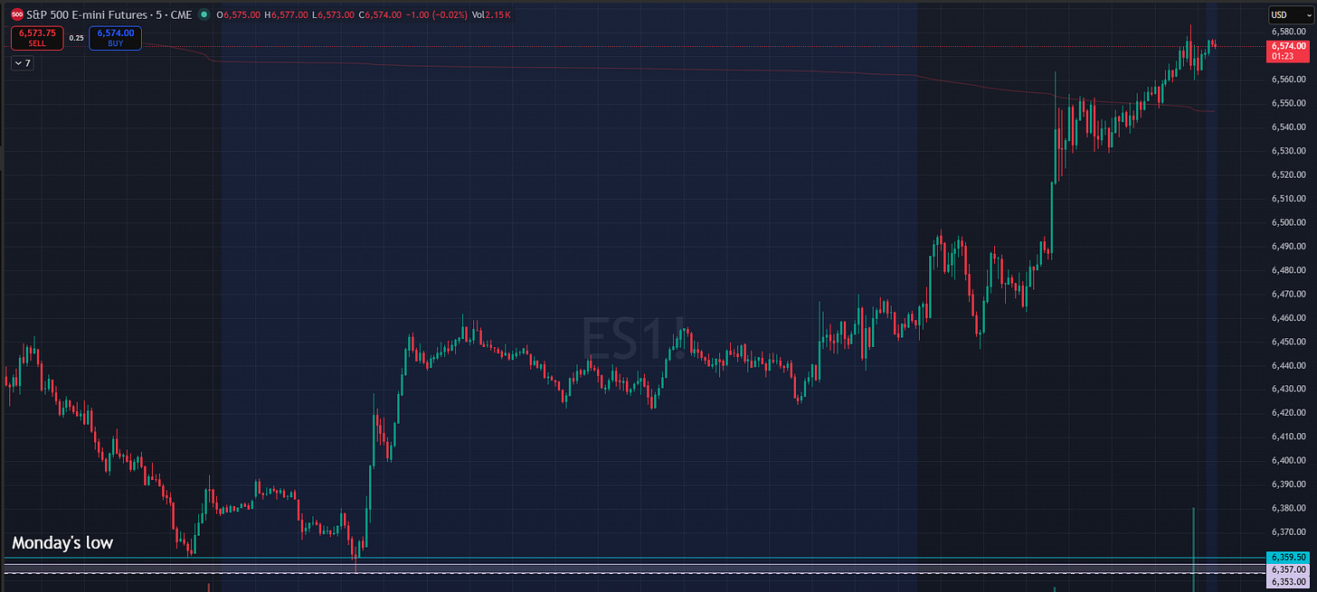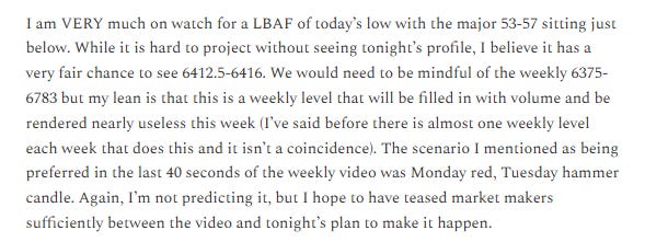 In last night’s plan I sufficiently teased market makers for them to provide a simply irresistible setup, a look below and fail of yesterday’s low into the 6353-6357 range.