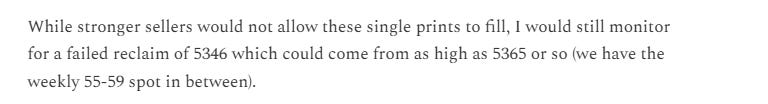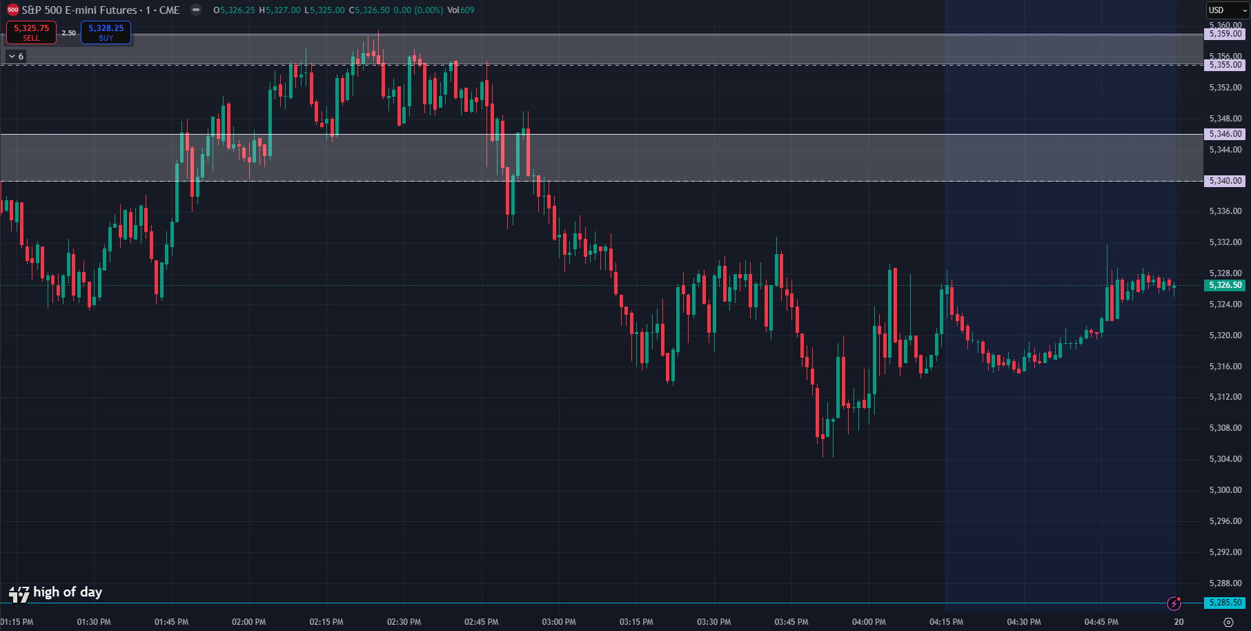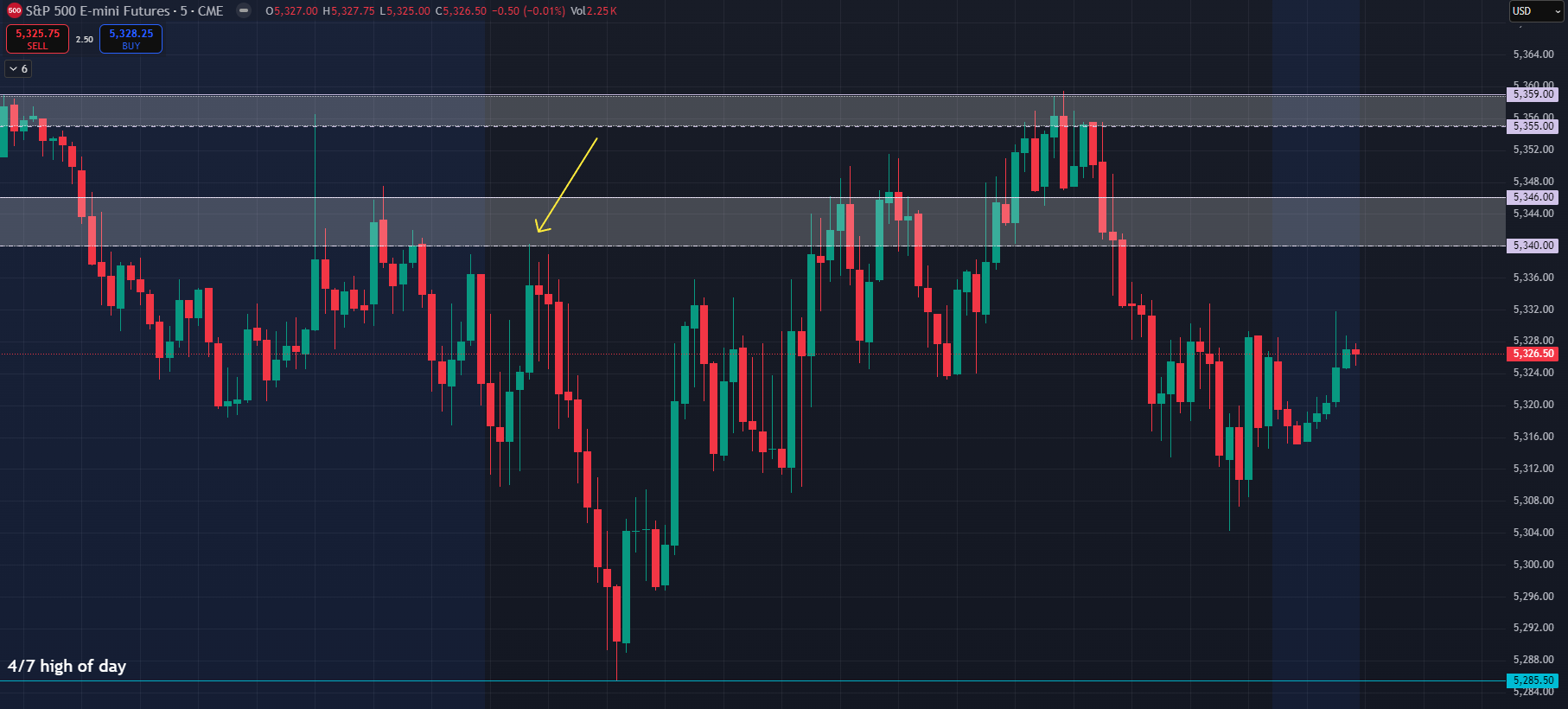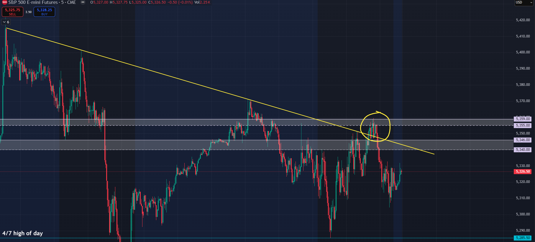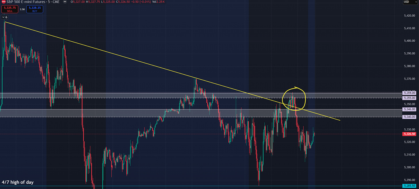 Futures traded higher for most of the night on Thursday night into Friday but came into the open in an active downtrend. During the premarket session, the 5355-5359 weekly level triggered a failed reclaim of 5340-5346 which ended up carrying forward into the open (high of the first 30 minutes was 5340.25and resolving down to 5285.5 which is notably the 4/7 high.