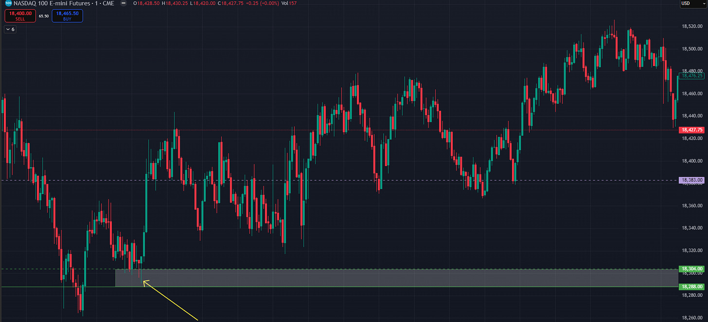In this case I favored an NQ long for a potential re-bid off low of day, looking for the 18288-18304 to see this bid. The area was well bid and both indices went on to make new high of day.