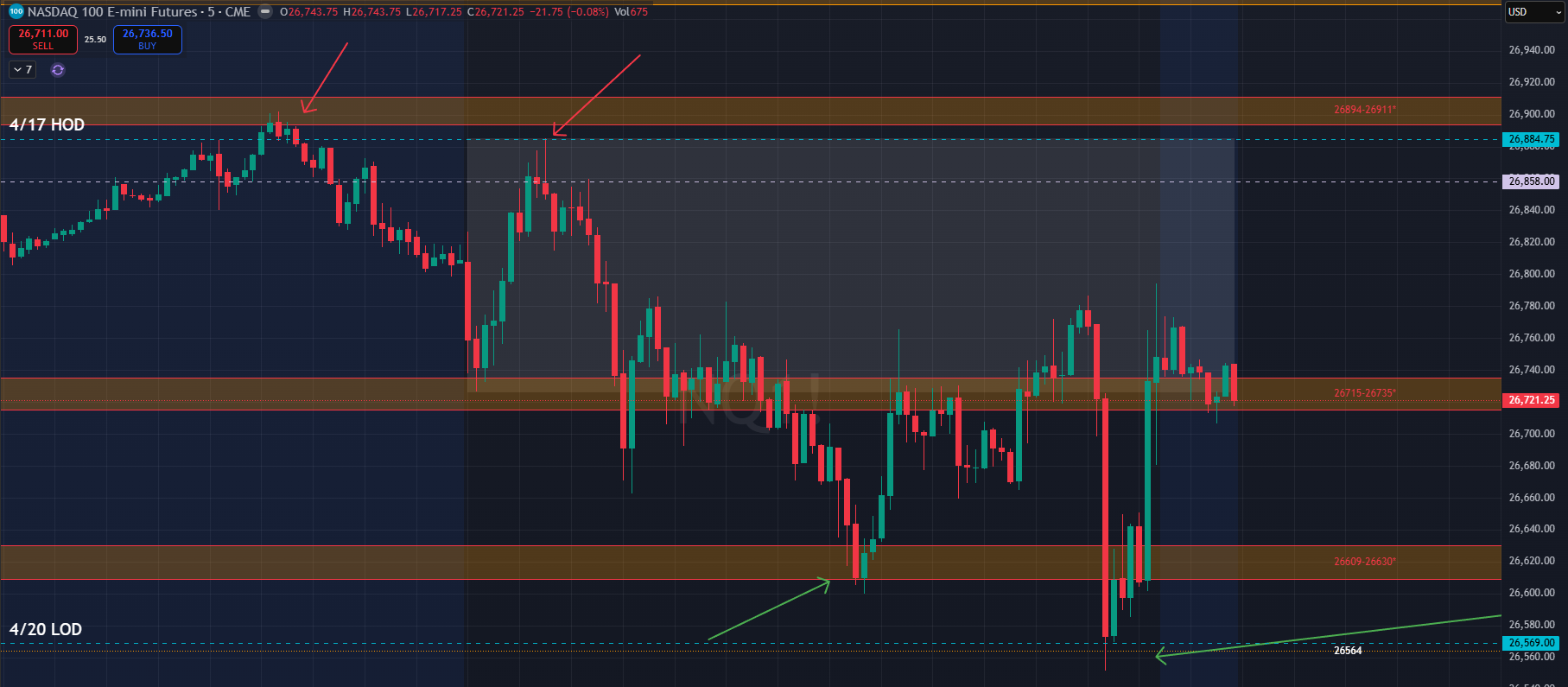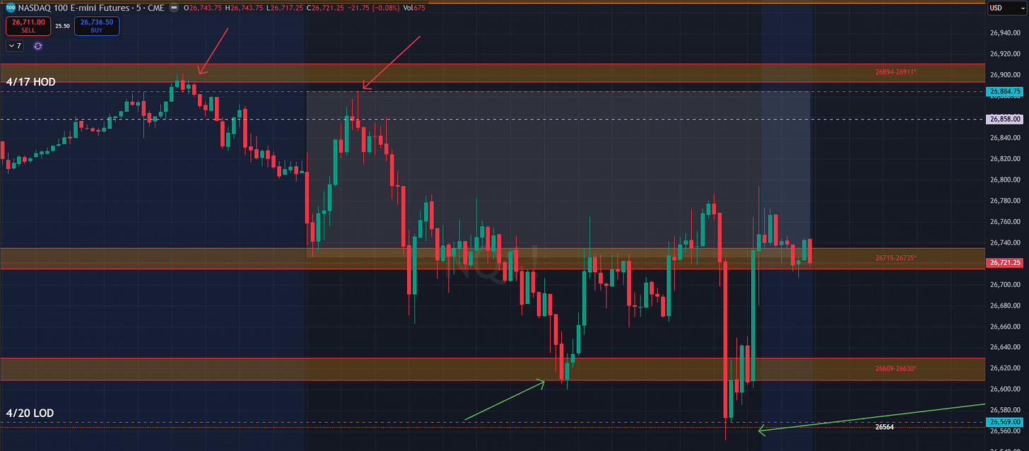 For NQ from last night and today we were looking to short failed breaks of 858 and/or 26885. The weekly 26894-26911 level triggered a look above and fail of both and it resolved for 300+ handles to the downside. This then triggered the look below and fail of 609-630 (twice) resolving for 180 during the cash session and did it again after hours on the Trump tweet after taking out the extreme low of the range (569) and filling the RTH bull gap.