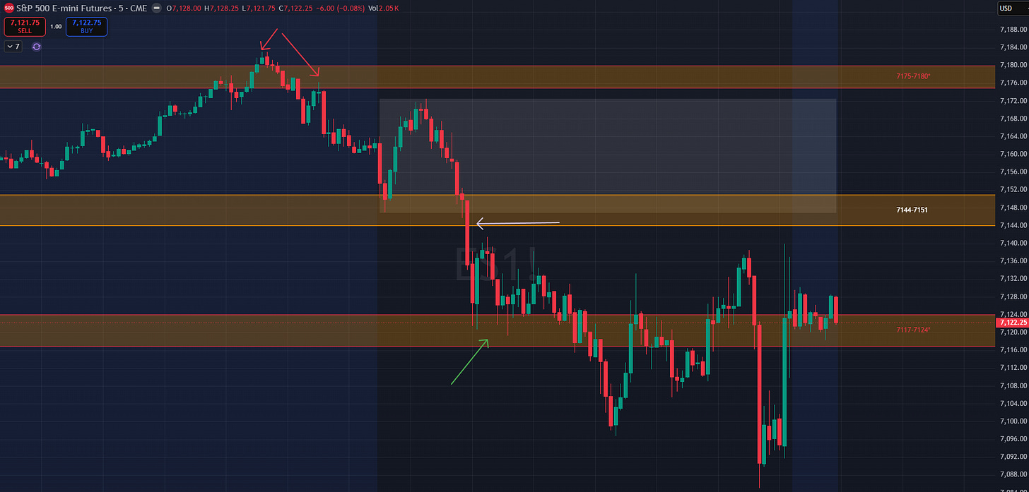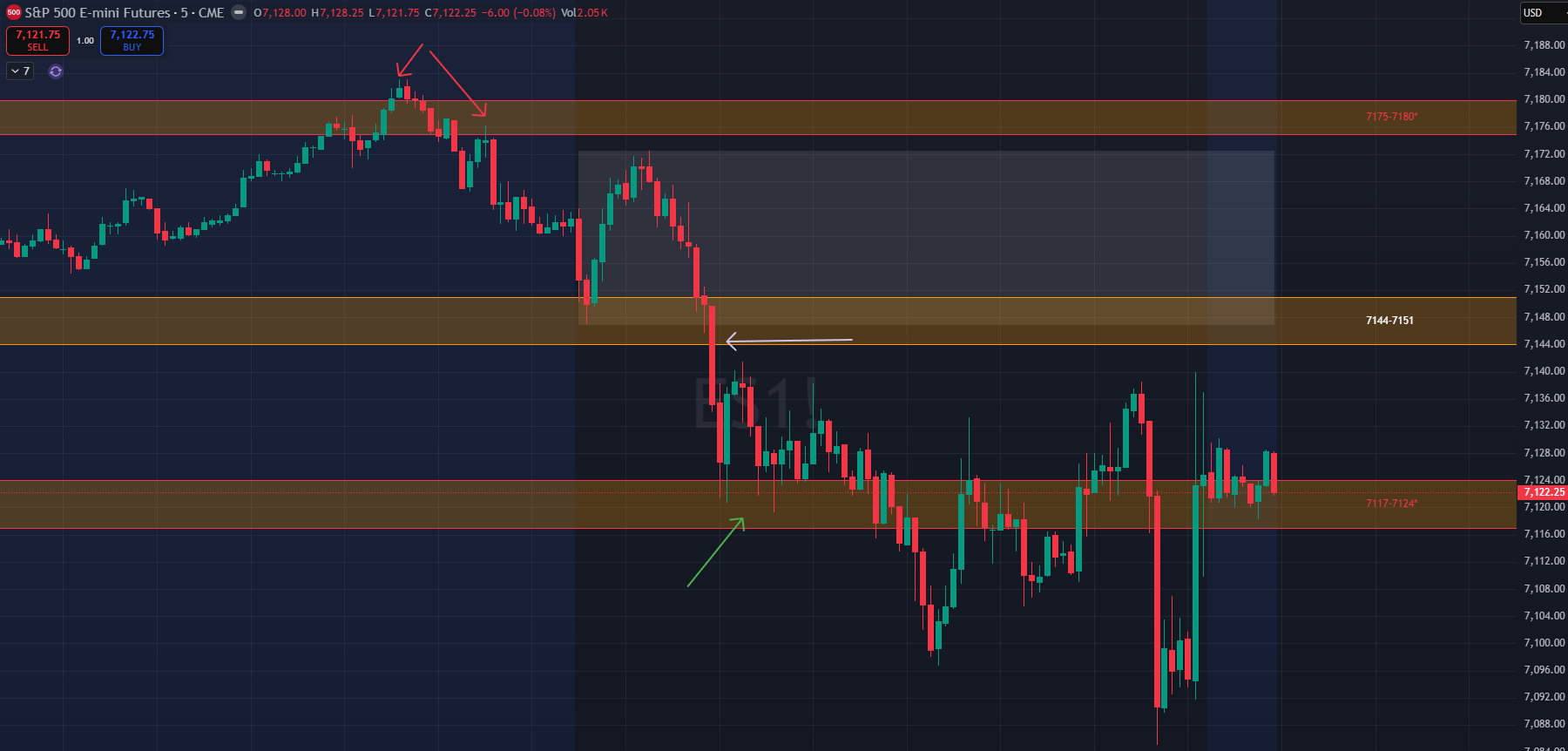 ES was just as clean on the short side but showed notable intraday relative weakness vs NQ. The LAAF triggered overnight into the open and once the IB low broke to the downside leaving potential single prints, the longs off 7117-7124 just didn’t have the strength to fill the potential (now confirmed) single prints. This must be noted and carried forward: