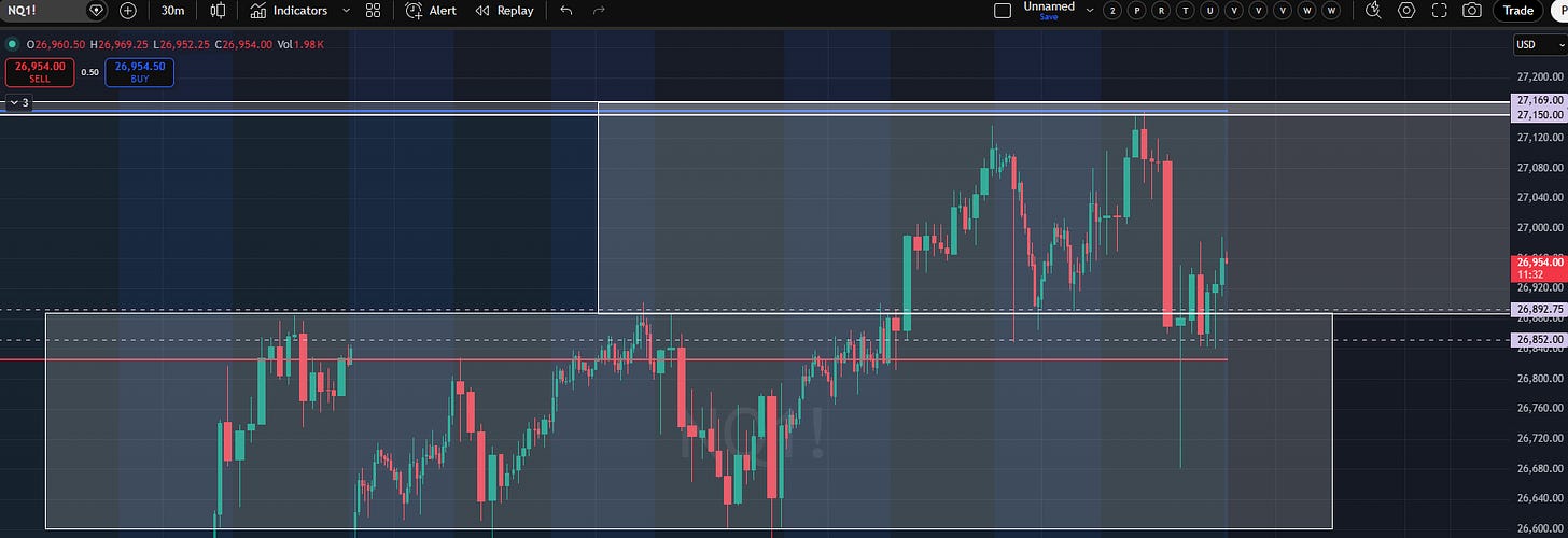 A wild day in the market but really quite technical. NQ hit the weekly 27150-27169 level which worked as a nice proxy for an approximate range double from its range break.