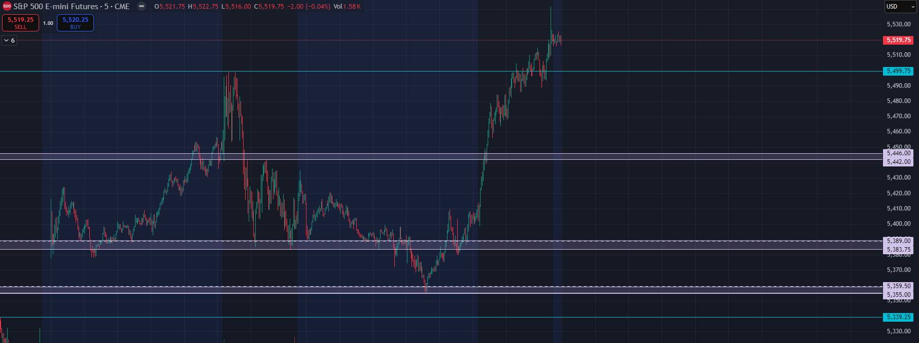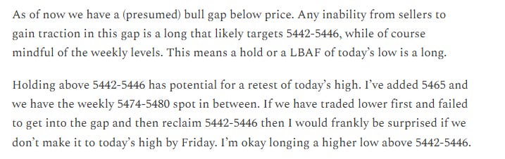 Today was all about the bull gap. Any inability from sellers was a long. Following such a failure, a reclaim of 5442-5446 was likely to produce a bullish engulfing day (take out yesterday’s high). Our 5355-5359.5 weekly level put in the overnight low and after a bit of a battle premarket, it seems that sellers fully capitulated and panic covered the open. The rest was history: