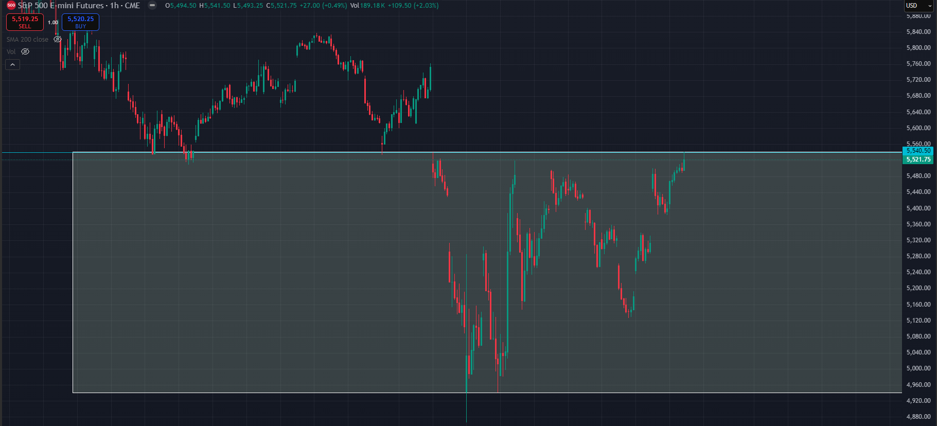 Today was incredibly strong all day and rallied right to the top of the prospective box I’ve been using since the early April low. I’m looking for a clean break with continuation above the 4/3 cash hours high on ES (5540.5) to consider this to be a range break. A look above and fail would be a poor look, but a sustained breakout has potential for a large upside move.