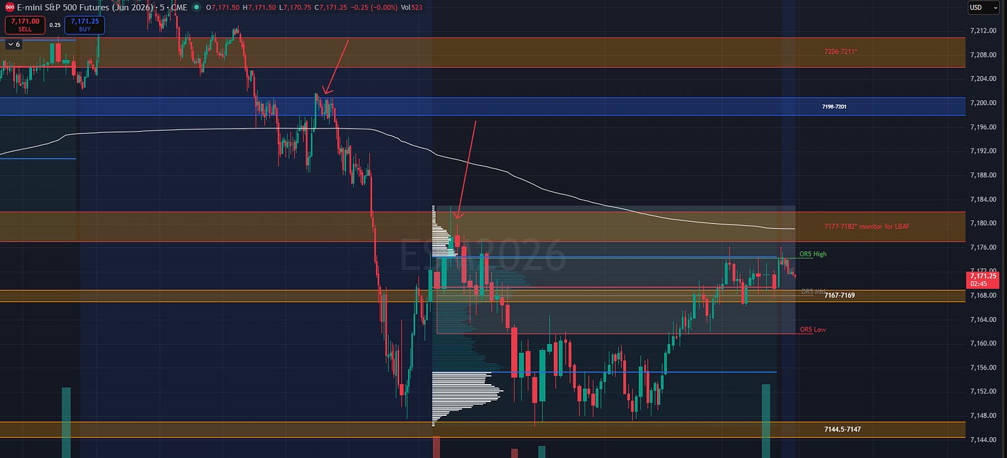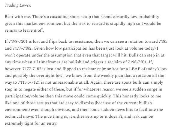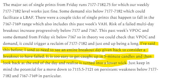 This was the one spot that could potentially negate a full move to 7115.5-7121 as it happened to contain Friday’s low (the breakout day from the multi-day balance). From the plan for Monday over the weekend reiterated in the Discord today: