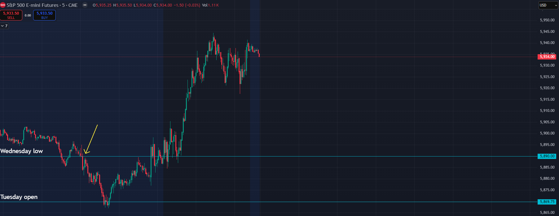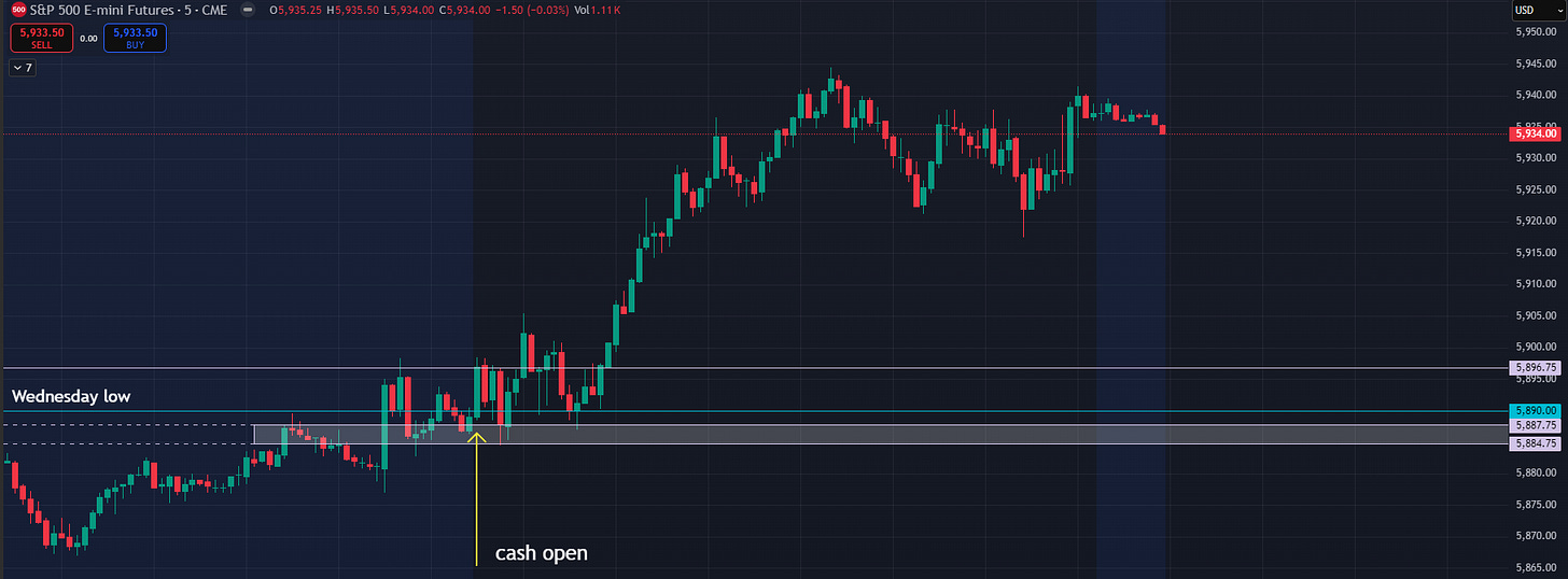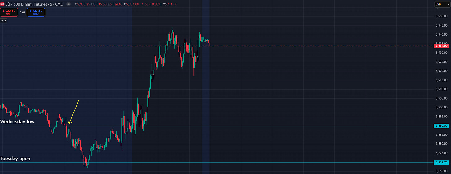 Trading lower first (especially overnight) while in a bullish trend is almost always a dip buy opportunity. We saw that again today. The overnight session essentially went on a “structure repair mission” completing yesterday’s work. Yesterday’s low of day 5890 represented filling of the Tuesday B-period single prints, and the overnight session completed the back fill to Tuesday’s open. This was an available trade but I’m not a huge fan of breakdown shorts in a bullish trend. I prefer to look for longs as a look below and fail once the “structure repair” short trade has played out: