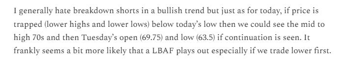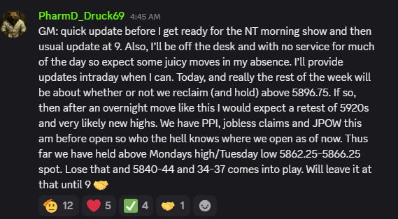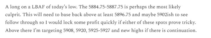 The cash session then opened right at yesterday’s low and the LBAF triggered from the 5884.75-5887.75 spot (5884.5 low of day). There was quite a battle for ultimate control of the key 5896.75 spot). Once bulls won the battle, all upside targets including new highs were hit. From last night’s plan and the morning update in Discord: