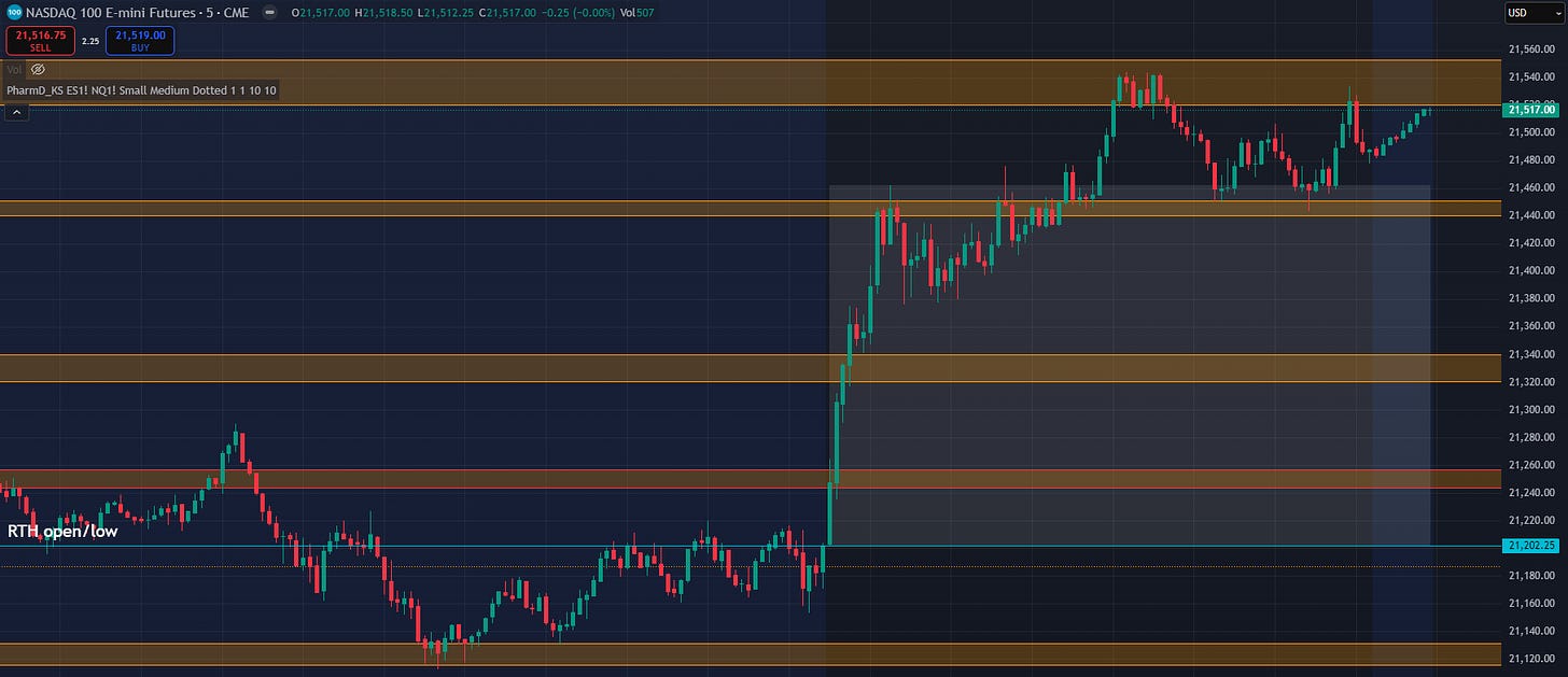 NQ lost 21200 but held the weekly level just below. It opened the cash session just above 200 and therefore both indices remained unthreatened by the cash open.