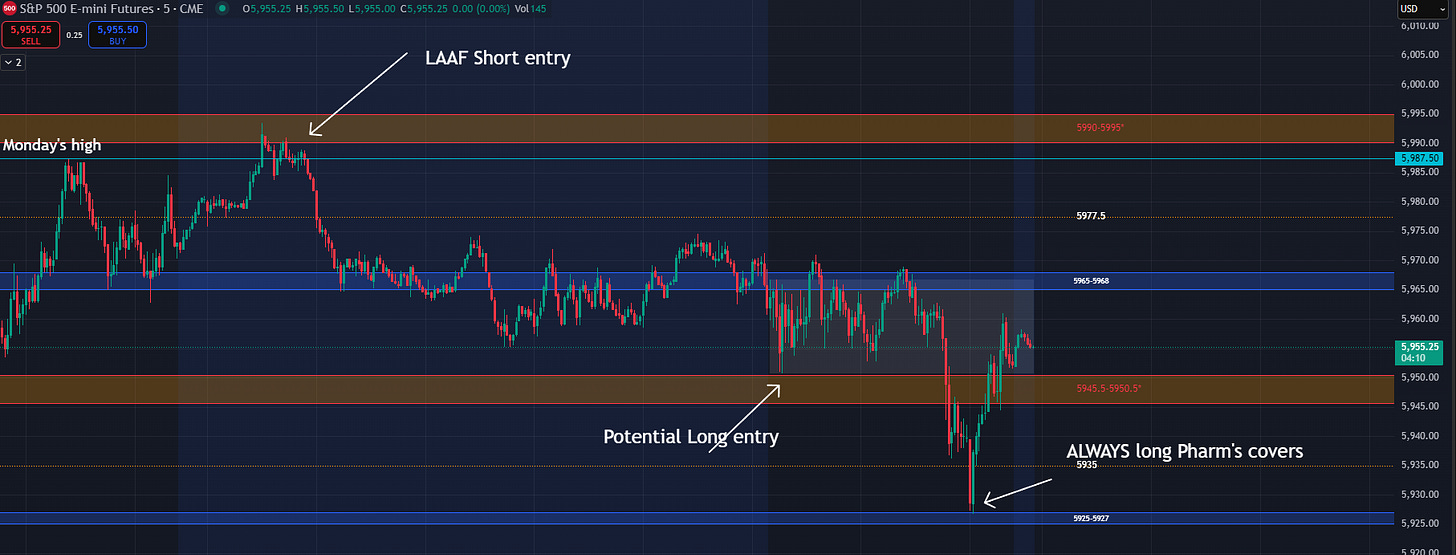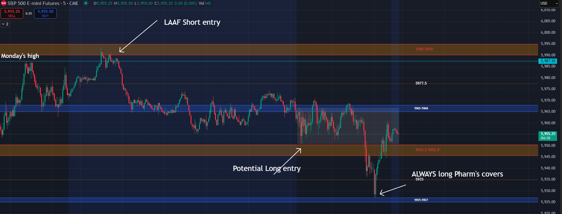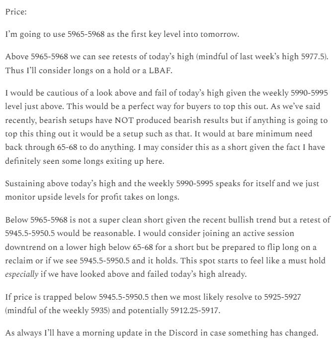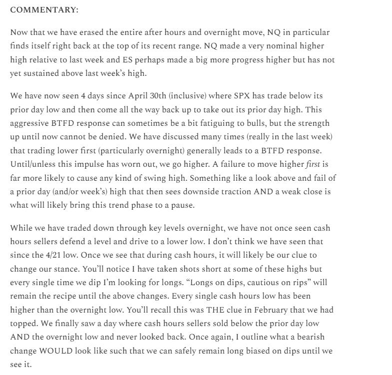 We finally saw a day where ES tested higher first and failed and it resulted in some weakness and an opportunity to be short. In a bullish trend, trading lower first almost always means the dip will be bought. Trading higher first and failing is far more likely to lead to selling pressure and a muted BTFD response. Sharing the full commentary from last night which can be seen as either a flex or a learning opportunity: