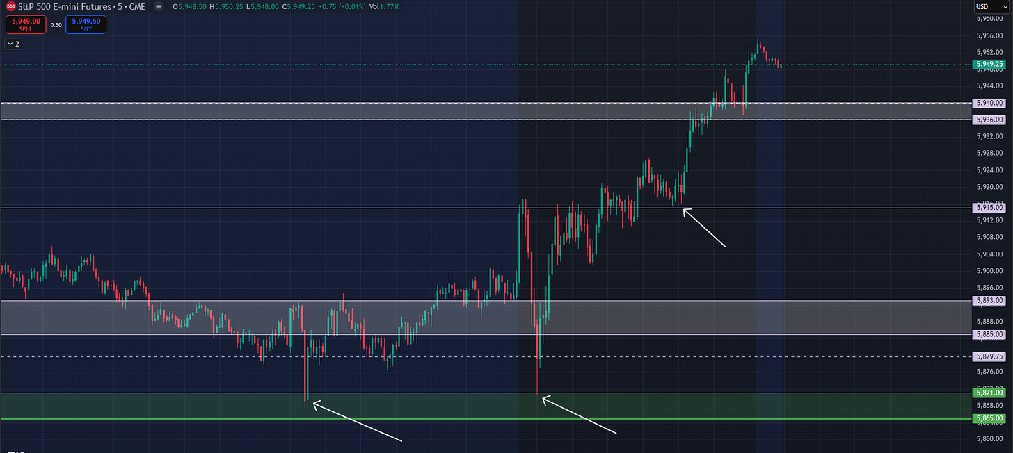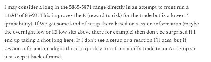 Sellers were able to grind through 5885-5893 during Asia and into Europe, with low of night being put in at the 5865-5871 range identified in the plan. This triggered a reclaim of 5885-5893 and resolved to the 5915 target at open. I was frankly surprised, though pleased, to have a second opportunity to get long in this area. Any inability from sellers to gain traction through an overnight low can trigger a long. The fact the overnight low was left there meant that a look below and fail or hold of the overnight low was a session long setup: