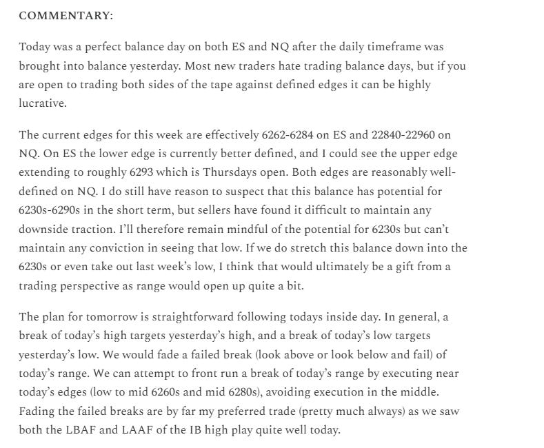 The trade for today was all about yesterdays inside day. I prefer to trade the failed breaks. We got a failed break of yesterday’s low during the overnight session, took out yesterday’s high and ran to the major target of Monday’s high. From last night: