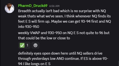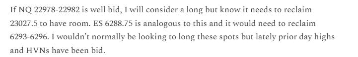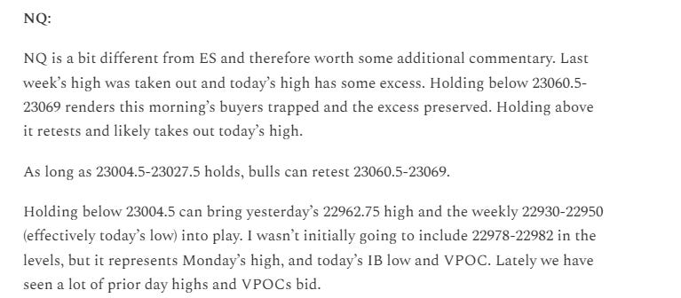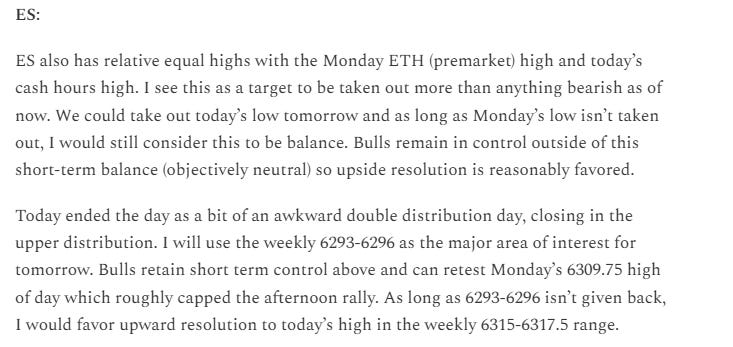 In last night’s plan we made note of the excess high on NQ QQQ 0.00%↑ which gave us reason to be a bit cautious and to consider shorts on NQ. ES, however, had two relative equal highs which I favored to be taken out. This meant that a significant divergence between ES SPY 0.00%↑ and NQ was somewhat likely. From last night’s plan regarding ES and NQ: