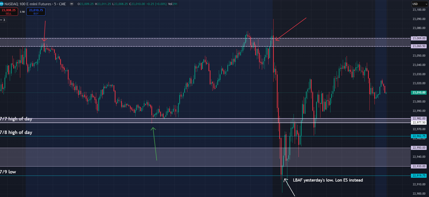 Note the overnight session opened and traded higher. NQ was firmly rejected in the 23060.5-23069 range and both ES and NQ remained weak for all of Asia session. NQ found its feet at the 22978-22982 range and ES at 6288.75 as theorized by recent patterns. NQ rallied into the open, opening just above 969 but was swiftly rejected back below. It drove straight through the overnight low to the 22930-22950 major target. It then saw a look below and fail of yesterday’s low, which was actually the signal to get long ES.