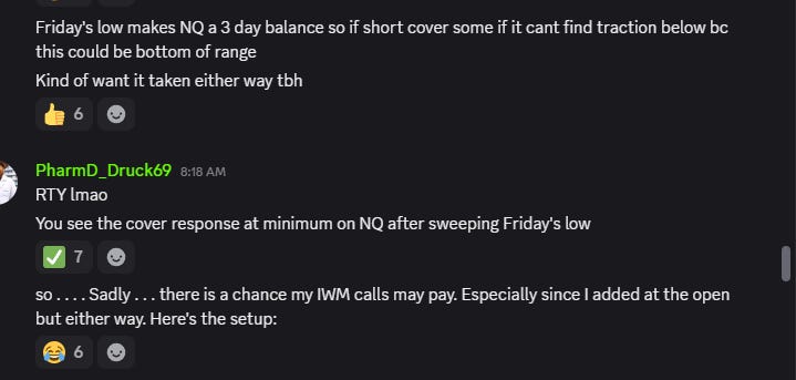It will be interesting to see if the QQQ 0.00%↑ weakness continues and if it translates into $SPY. I’ll presume NQ to be a 3-day balance for now after sweeping Friday’s low. Therefore, it is presumed range low until proven otherwise: