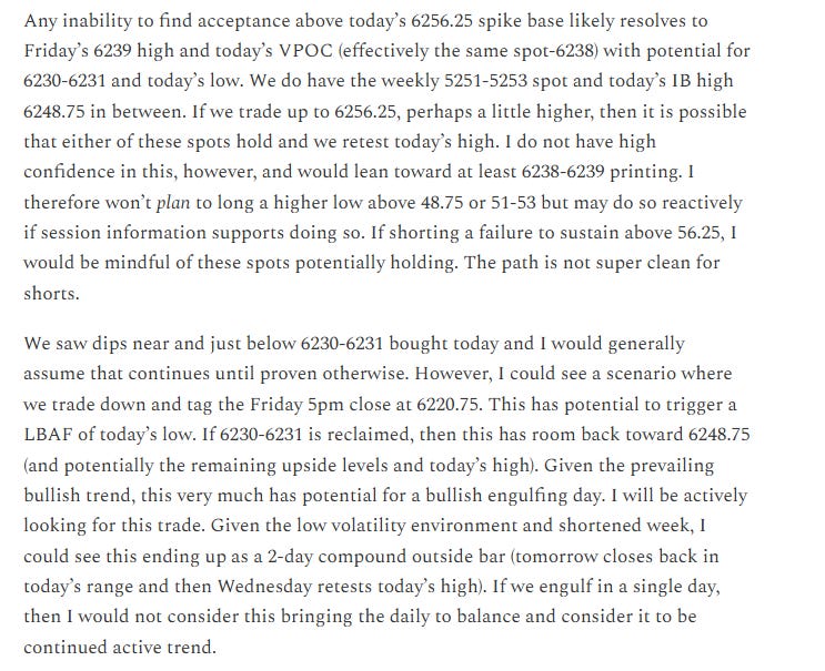 Coming into today we were short failures to sustain above 6256.25 and looking to join dip buyers below 6230. These edges worked both overnight and intraday.