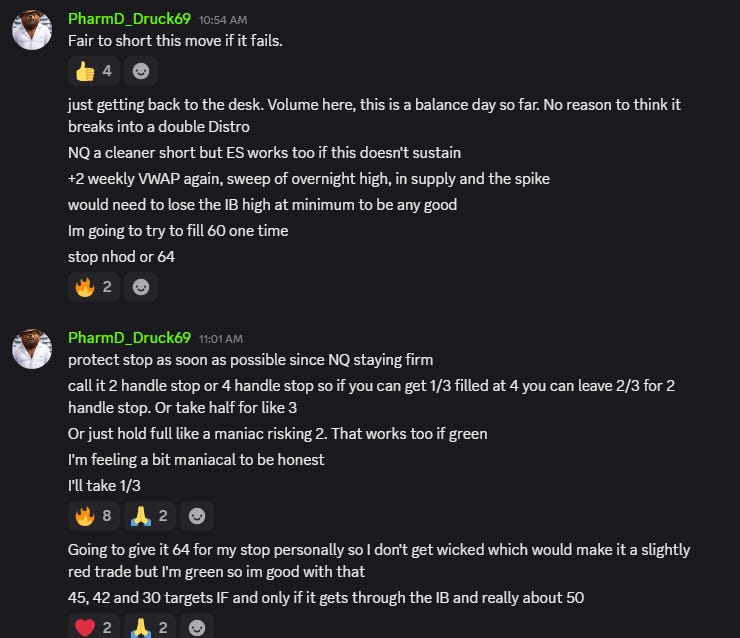 After the cash hours 6227.5 low, buyers rallied to a new high of day in the afternoon but were offsides in doing so. This gave us an opportunity for a quick short back to the center in the Discord, filling 6260 (6261.5 high of day) with major targets of 6245 and 6242 (afternoon low 6240) for an R of 9